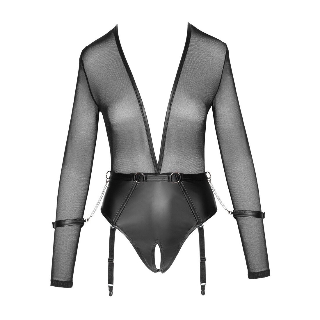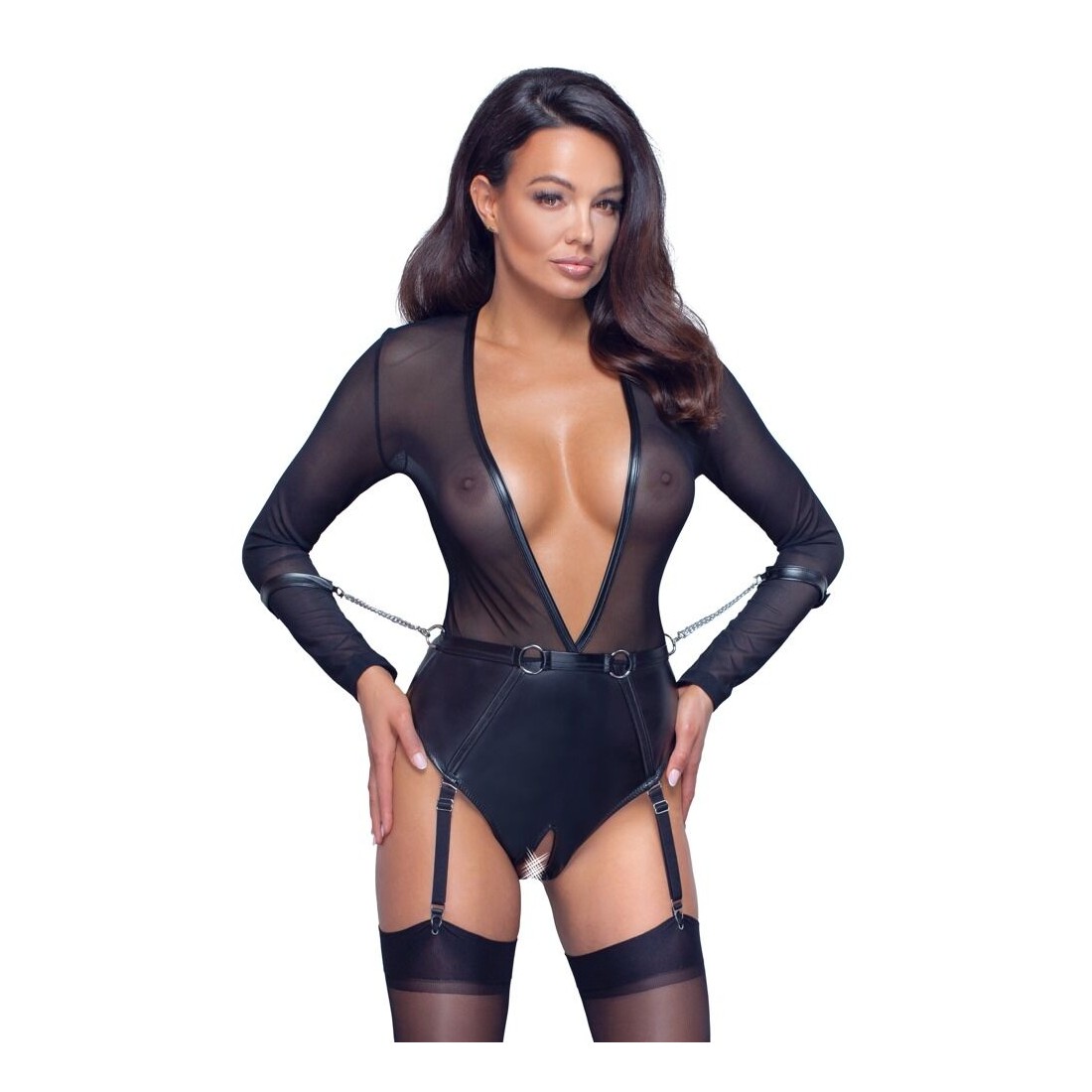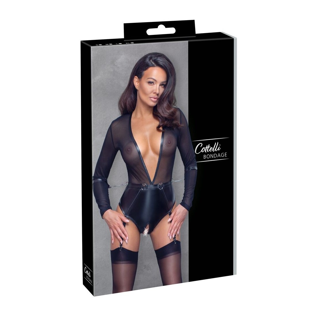 Body reggicalze extra scollato di Cottelli BONDAGE con top trasparente a maniche lunghe in powernet e parte di mutandine completamente inguinale in look opaco di tendenza - ideale outfit da sesso spontaneo! Cintura saldamente cucita con 2 anelli sul davanti e un anello su ogni lato per fissare le manette in dotazione con catene a moschettone. Manette con chiusure in velcro regolabili. Le bretelle regolabili sono rimovibili.