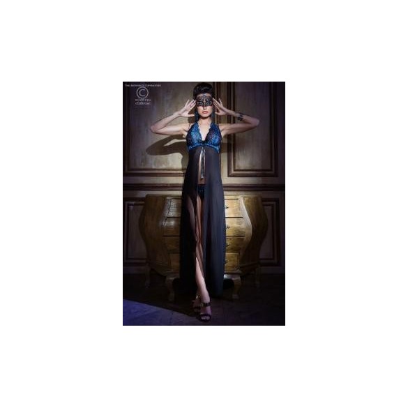 Seducente vesTAGLIA lunga in morbida microrete di alta qualit con elegante pizzo floreale color blu zaffiro sulle coppe e lungo spacco anteriore. Legatura al collo. Include tanga in coordinato. TAGLIA S/M.