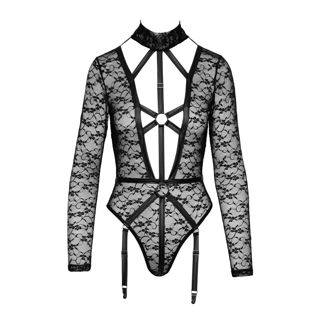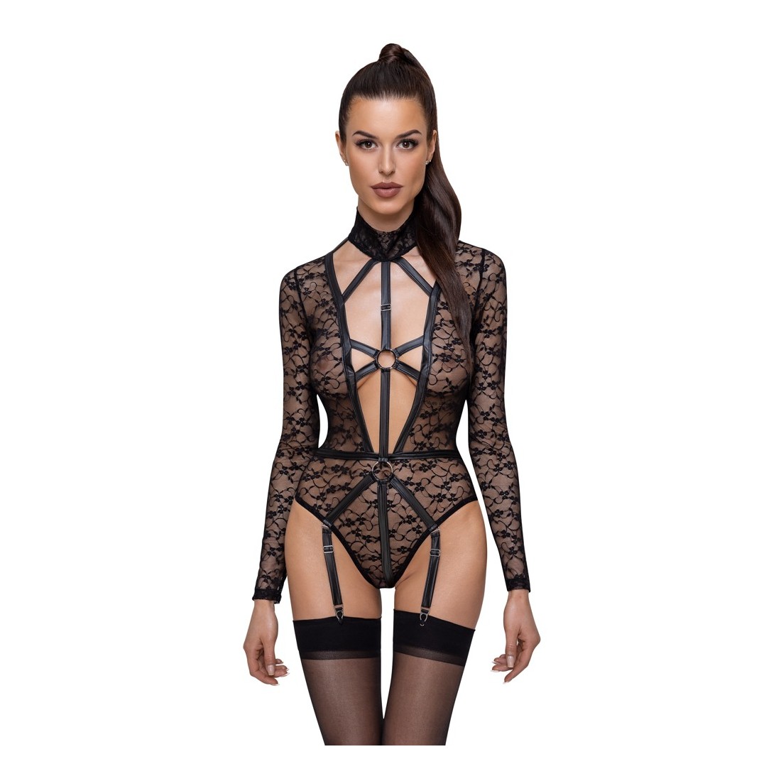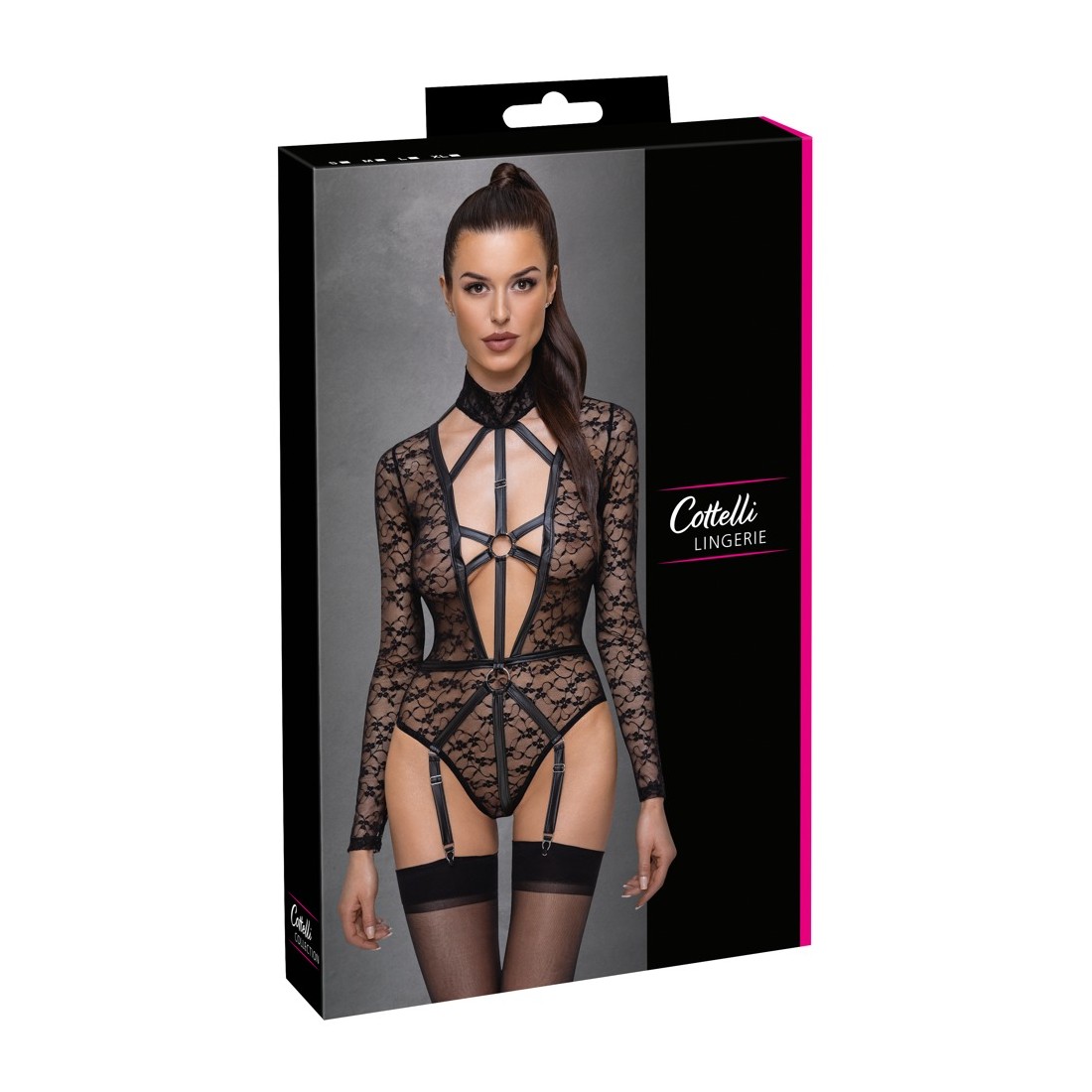 Bodystocking a maniche lunghe di Cottelli LINGERIE completamente realizzato in fine e morbido pizzo con raffinati dettagli in look opaco. Elastico dappertutto e morbidamente coccoloso per una vestibilità aderente con il massimo comfort. Taglio basso fino all'ombelico sul davanti e in un provocante look a imbracatura con fasce elastiche e anelli. Le fasce elastiche decorative tengono anche tutto insieme piacevolmente nella generosa scollatura posteriore. Il colletto alto in pizzo si chiude con 2 bottoni al collo. Chiusura con bottoni a pressione sul cavallo. Le bretelle sono regolabili e anche completamente rimovibili.