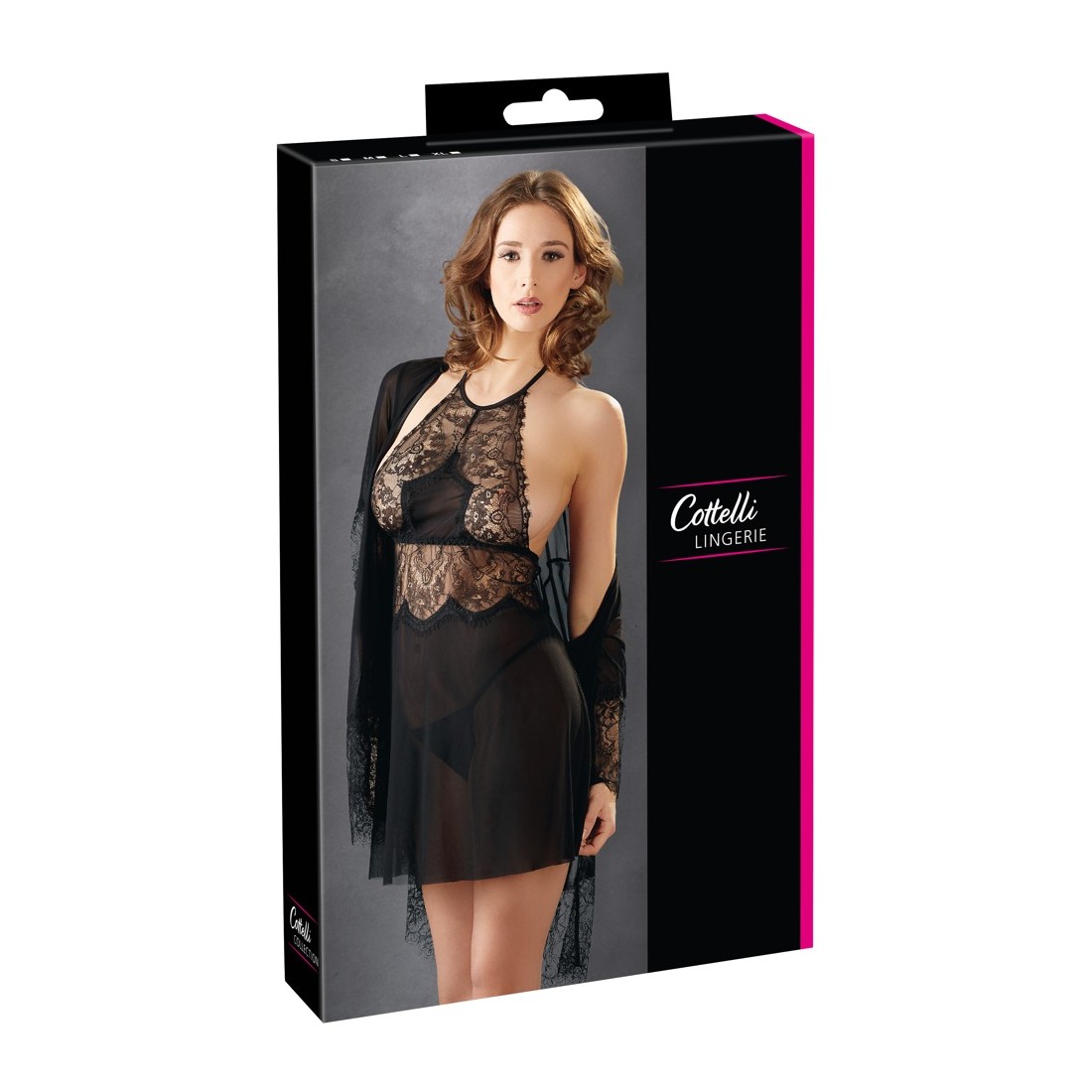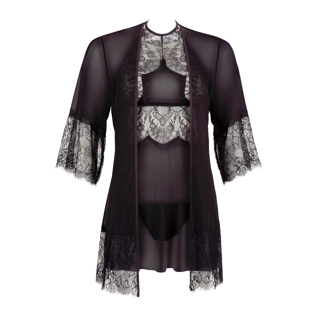 Con questo set sei perfettamente vestita per una serata erotica! Mentre la gonna è fatta di powernet nero, l'uso su larga scala di pizzo a ciglia nella parte superiore fornisce un look nobile - un inserto powernet sulla scollatura migliora questo effetto. E grazie alla trasparenza vaporosa del pizzo, anche i due argomenti migliori lampeggiano: che spettacolo! Ma anche la vista posteriore sa come convincere, perché il negligee è dotato di un piccolo halterneck da legare e sotto la schiena libera l'inserto di pizzo è continuato. Il kimono colpisce anche per il suo materiale trasparente e per un altro colpo d'occhio - sia i polsini che l'ampio orlo sono fatti di sensuale pizzo di ciglia e forniscono così un effetto wow. Perizoma incluso.