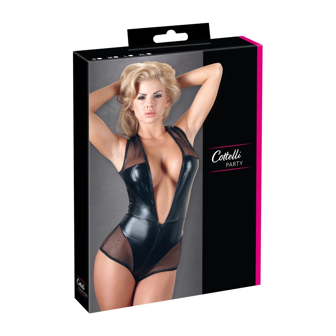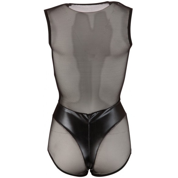 Corpo senza maniche realizzato in una combinazione di wetlook e rete in nero. Con cerniera lampo attraverso il cavallo.