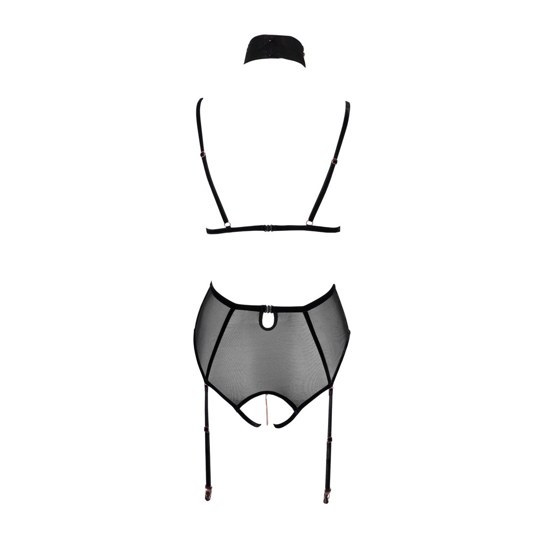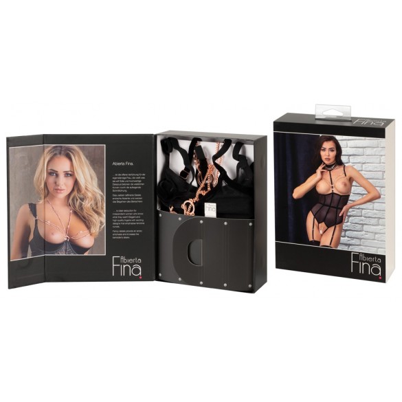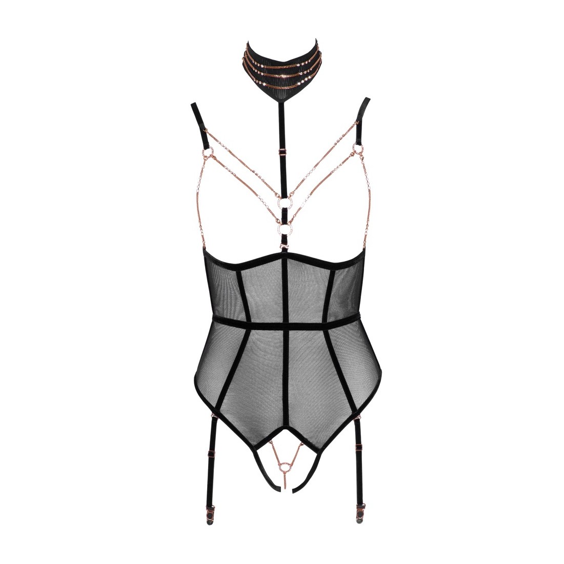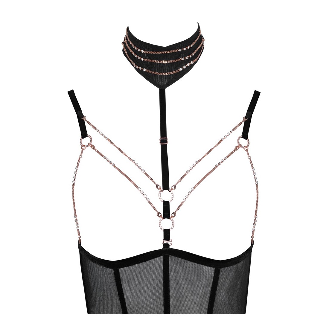 Body senza seno di Abierta Fina con cavallo completamente aperto in powernet con strisce di velluto elastico ed elementi di gioielleria color oro rosa. Cinghie e bretelle regolabili, bretelle anche rimovibili. Cinghia regolabile del décolleté con collana ornata di catene (con chiusura a bottone) anch'essa rimovibile, così come le catene del seno con piccoli moschettoni e la catena inguinale con anello decorativo. Tutte le catene sono inoltre decorate con piccoli strass. Vista posteriore in look a due pezzi con due chiusure a clip su reggiseno e mutandine/cintura in vita.