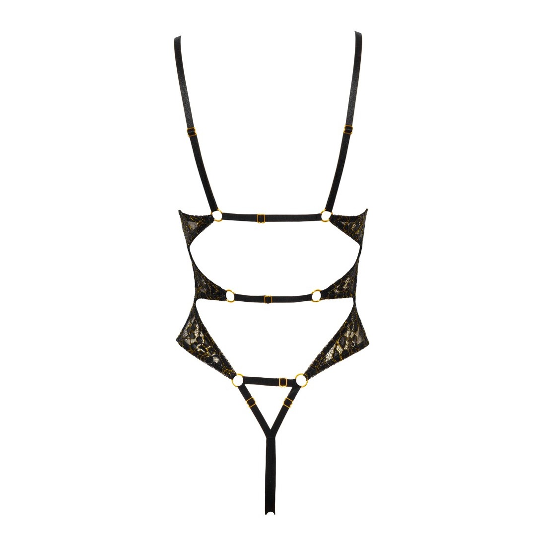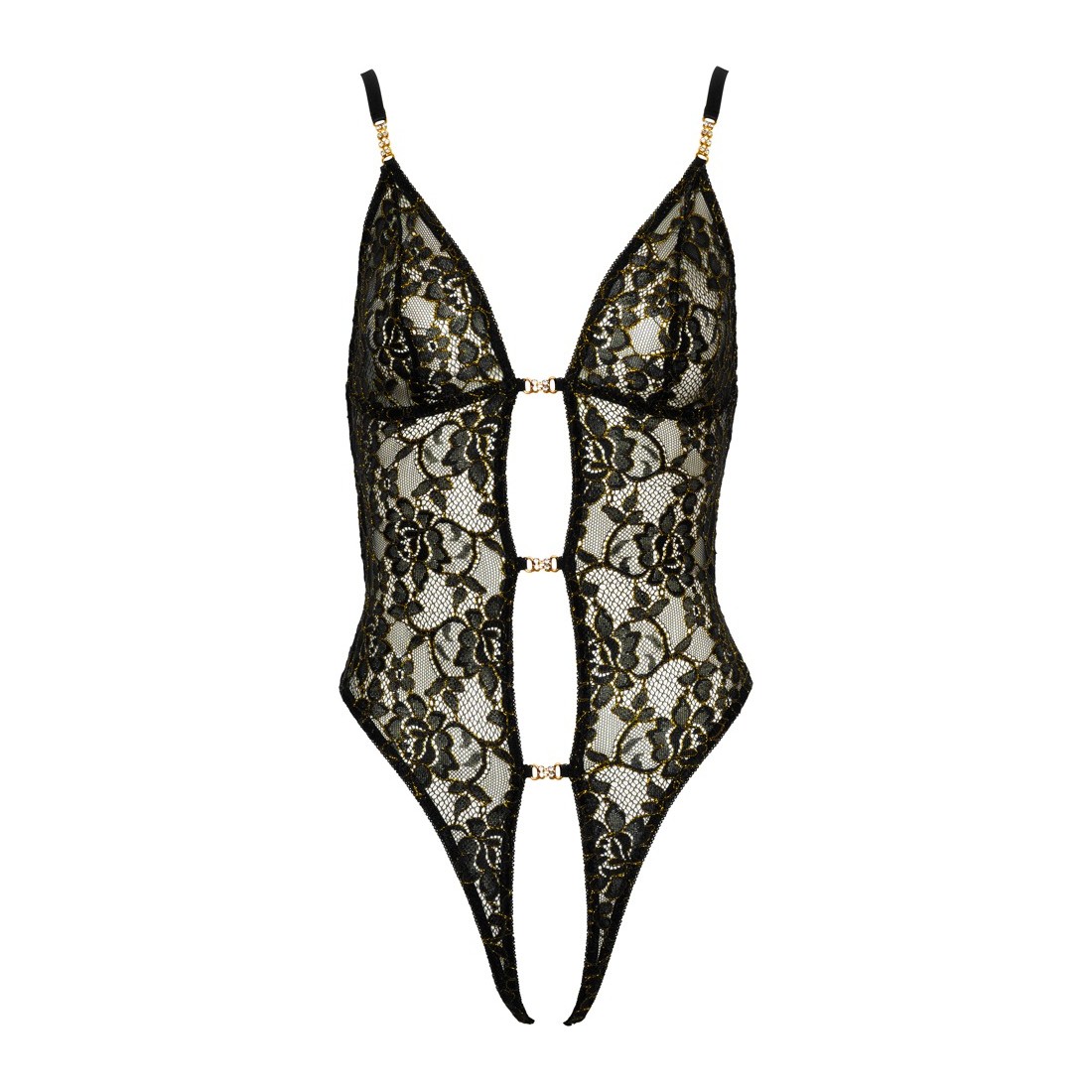 Body elegante ed erotico di Abierta Fina realizzato in pizzo floreale nero con fili metallici color oro intrecciati. La parte anteriore completamente aperta è tenuta insieme solo da 3 ponti decorativi glitterati. Ci sono anche elementi scintillanti nella parte anteriore delle cinghie regolabili. Le cinghie elastiche regolabili su anelli color oro nella parte posteriore quasi aperta e sopra il fondo aperto assicurano una vestibilità perfetta.
