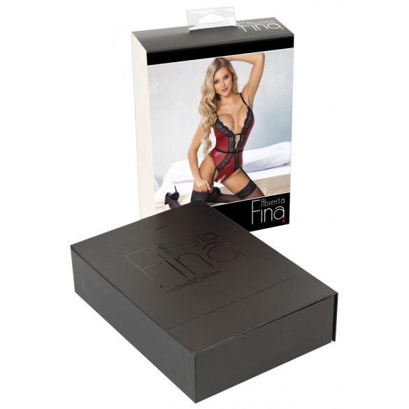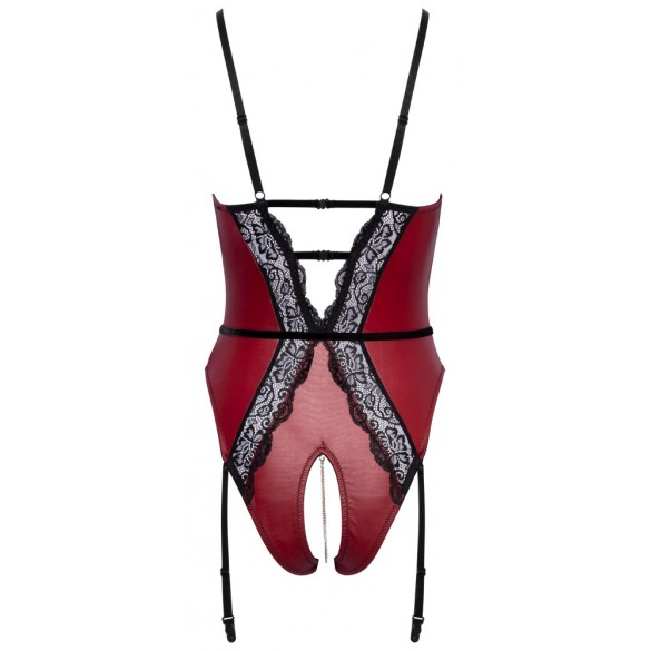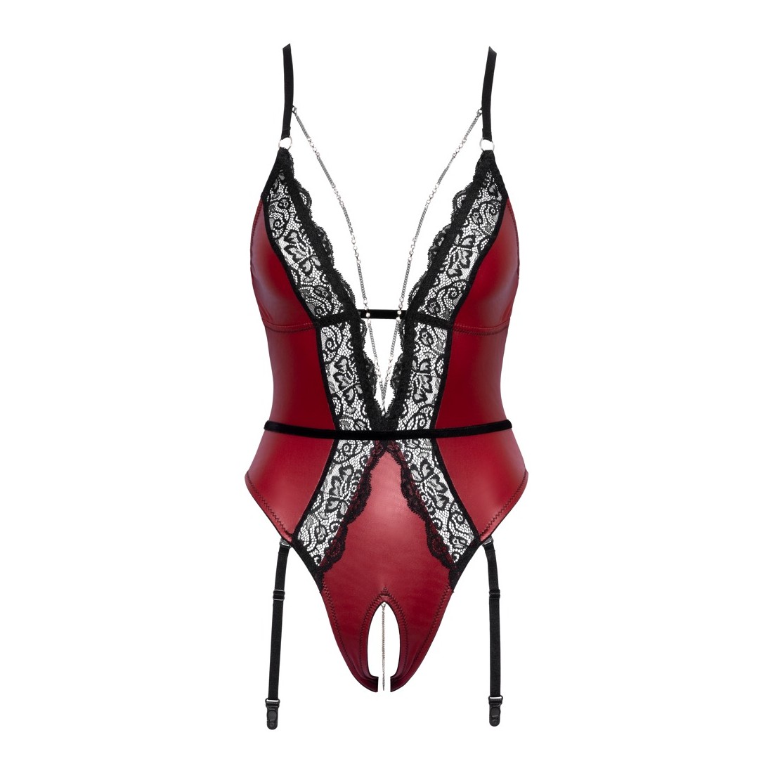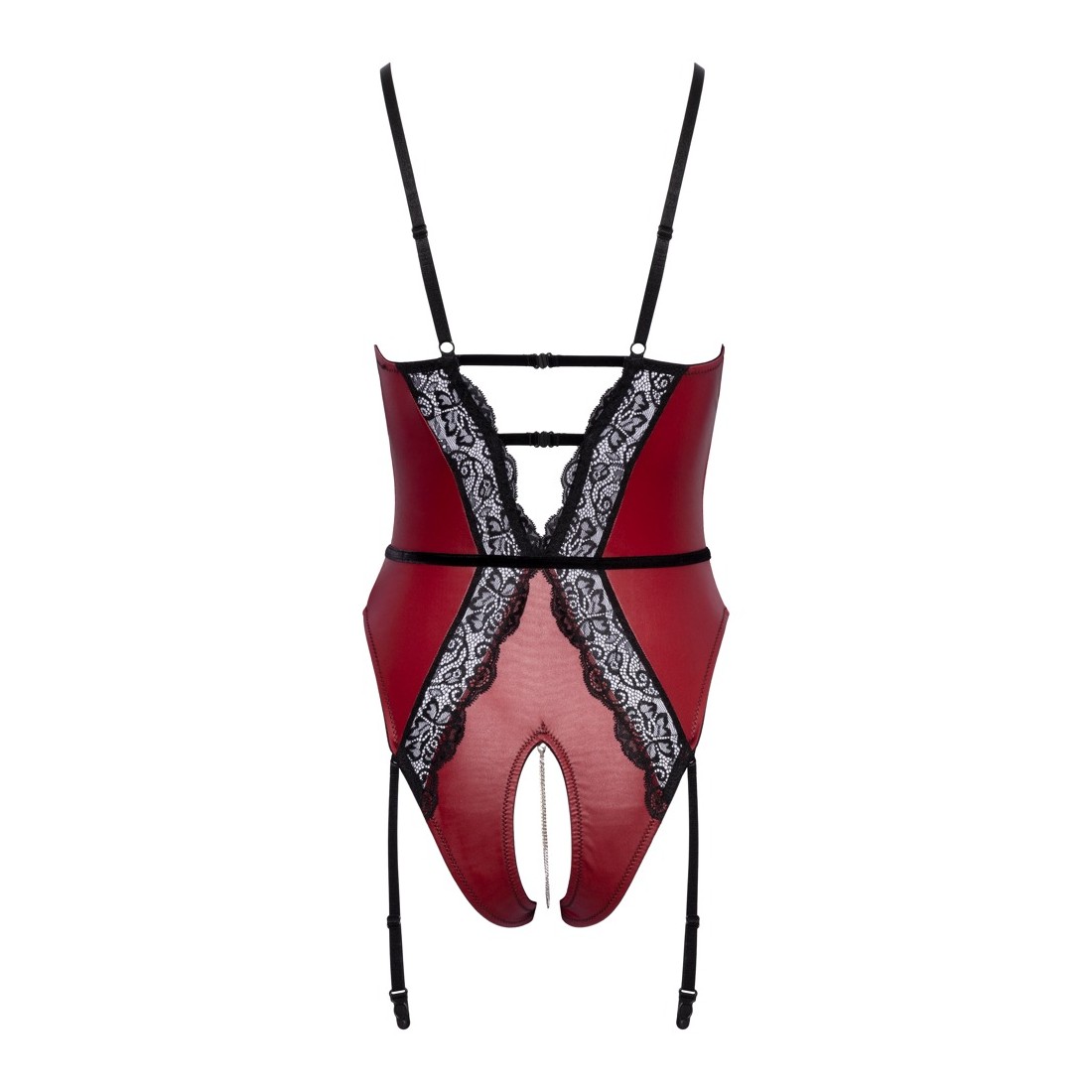 Body senza cavallo di Abierta Fina in un elegante look rosso opaco con inserti in pizzo nero davanti e dietro che accentuano la silhouette. Con una fascia in vita cucita per una maggiore enfasi. Una scollatura profonda con cinghie di collegamento e 2 catene scintillanti color argento staccabili. Anche la catena stimolante nel cavallo aperto è rimovibile, così come le bretelle regolabili. Il profondo taglio posteriore ha 2 cinghie elastiche con chiusure a clip. Le cinghie sono regolabili per adattarsi.