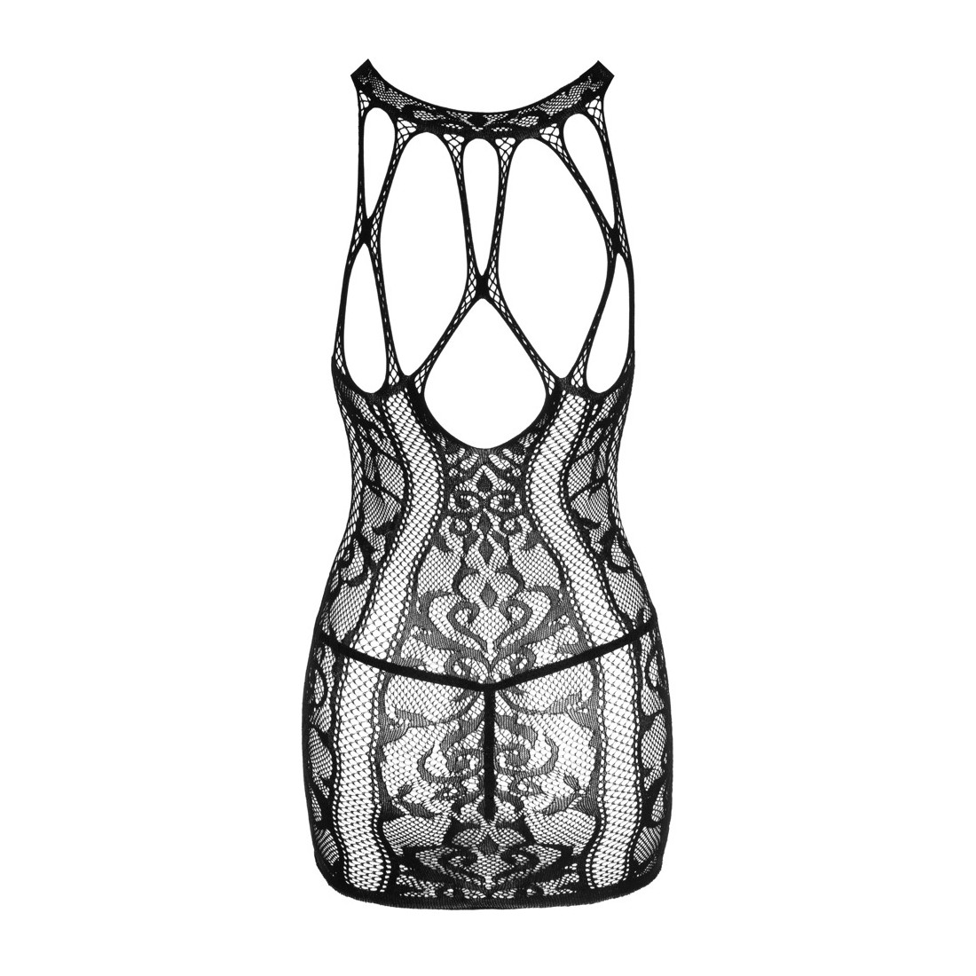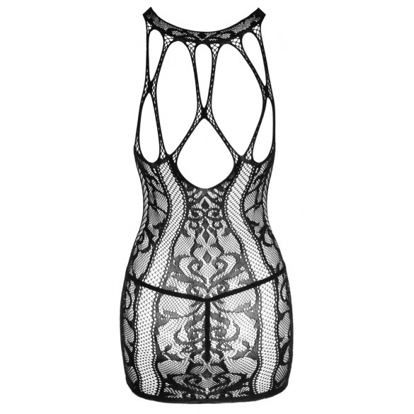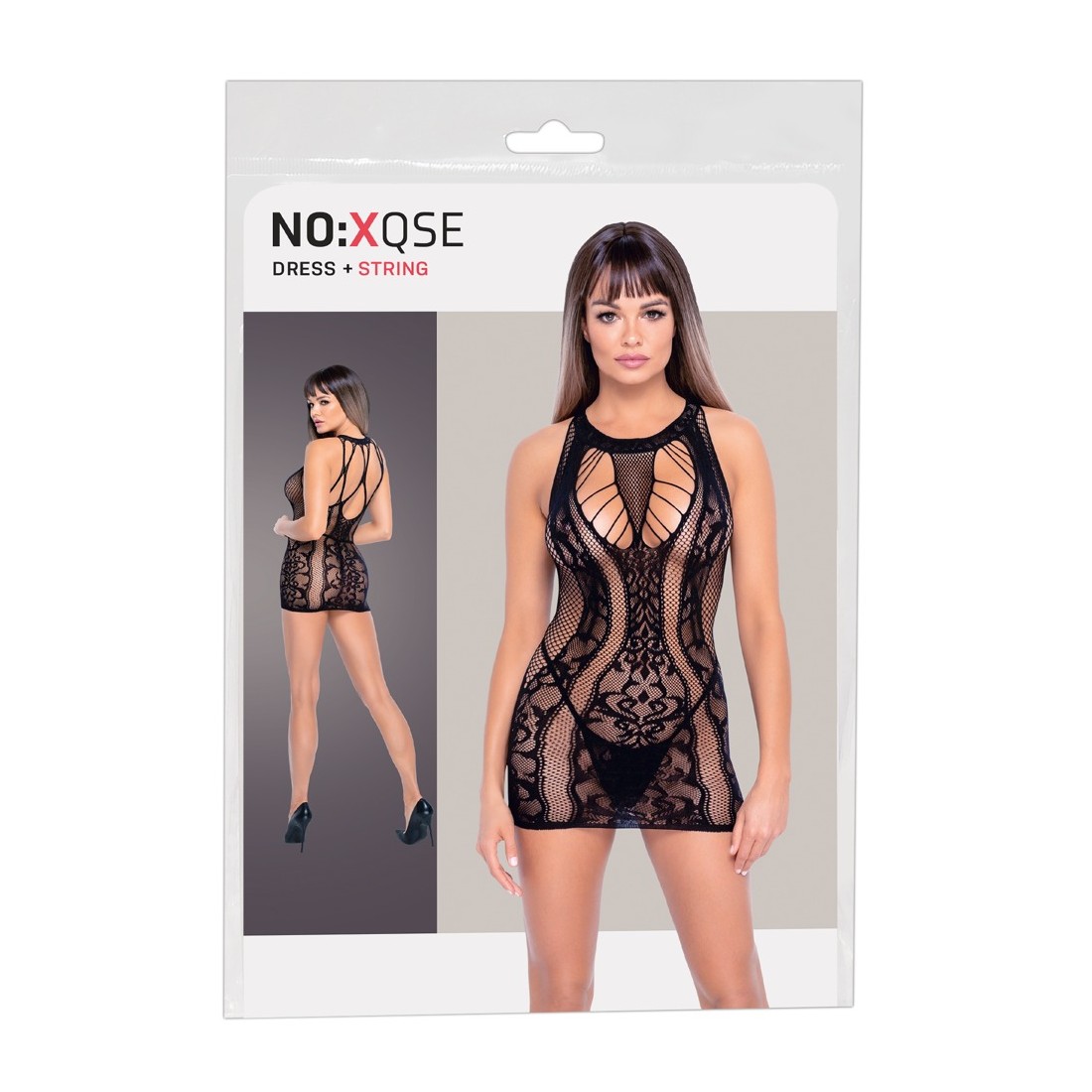 Vestiti in vari look a rete con ornamenti intrecciati di NO:XQSE, compreso il perizoma di pizzo. Tutto fatto senza cuciture e meravigliosamente morbido ed elastico per un alto comfort di vestibilità. Ritagli sul décolleté decorati con fasce elastiche. Look stravagante sul retro fatto di fasce elastiche e rete.