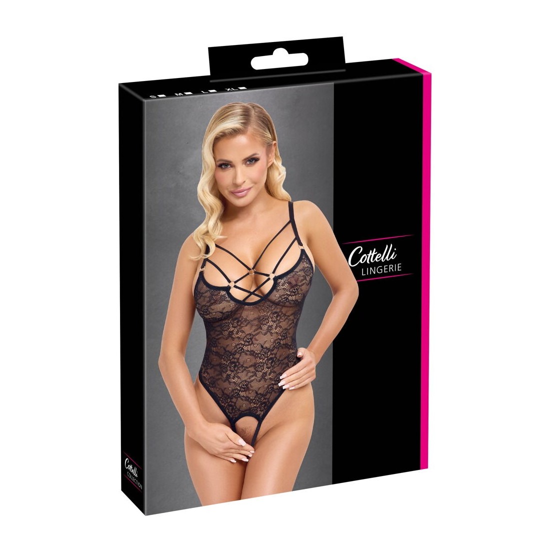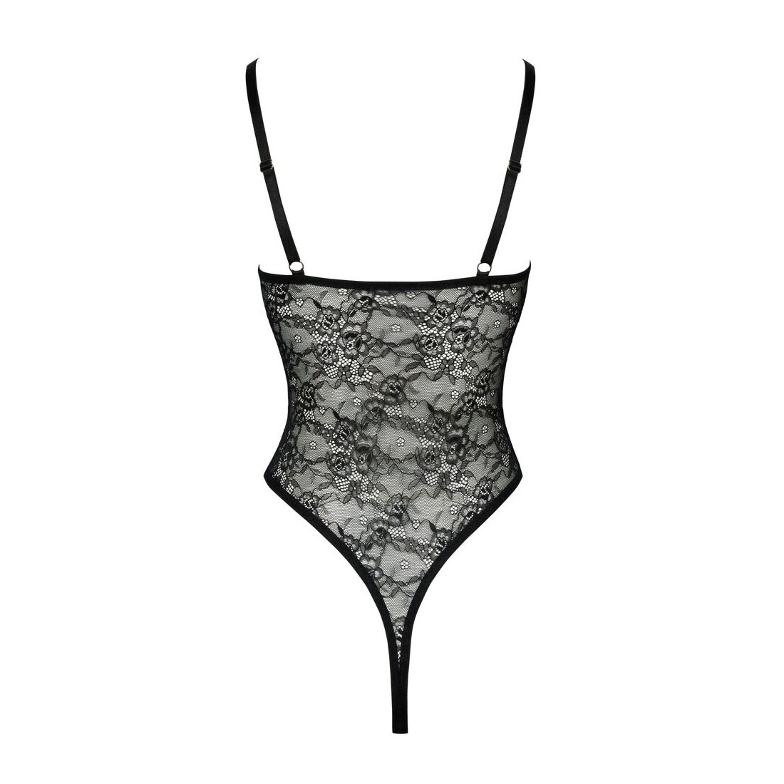 Body perizoma Cottelli LINGERIE ouvert in pregiato pizzo nero floreale, elastico e morbido al tatto. Con eleganti spalline elastiche e anelli decorativi color argento nella zona del décolleté. Le spalline possono essere regolate per adattarsi. I tagli extra alti sulle gambe mettono in risalto il sedere e le gambe. Seducente apertura sul mons veneris e sul cavallo.