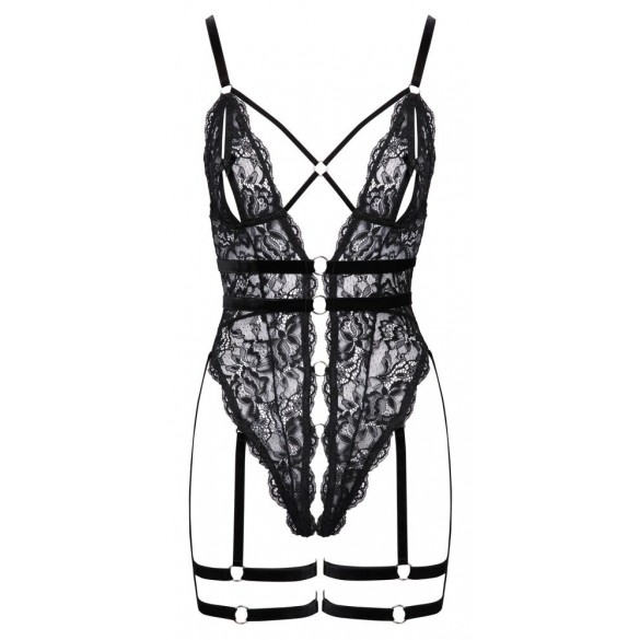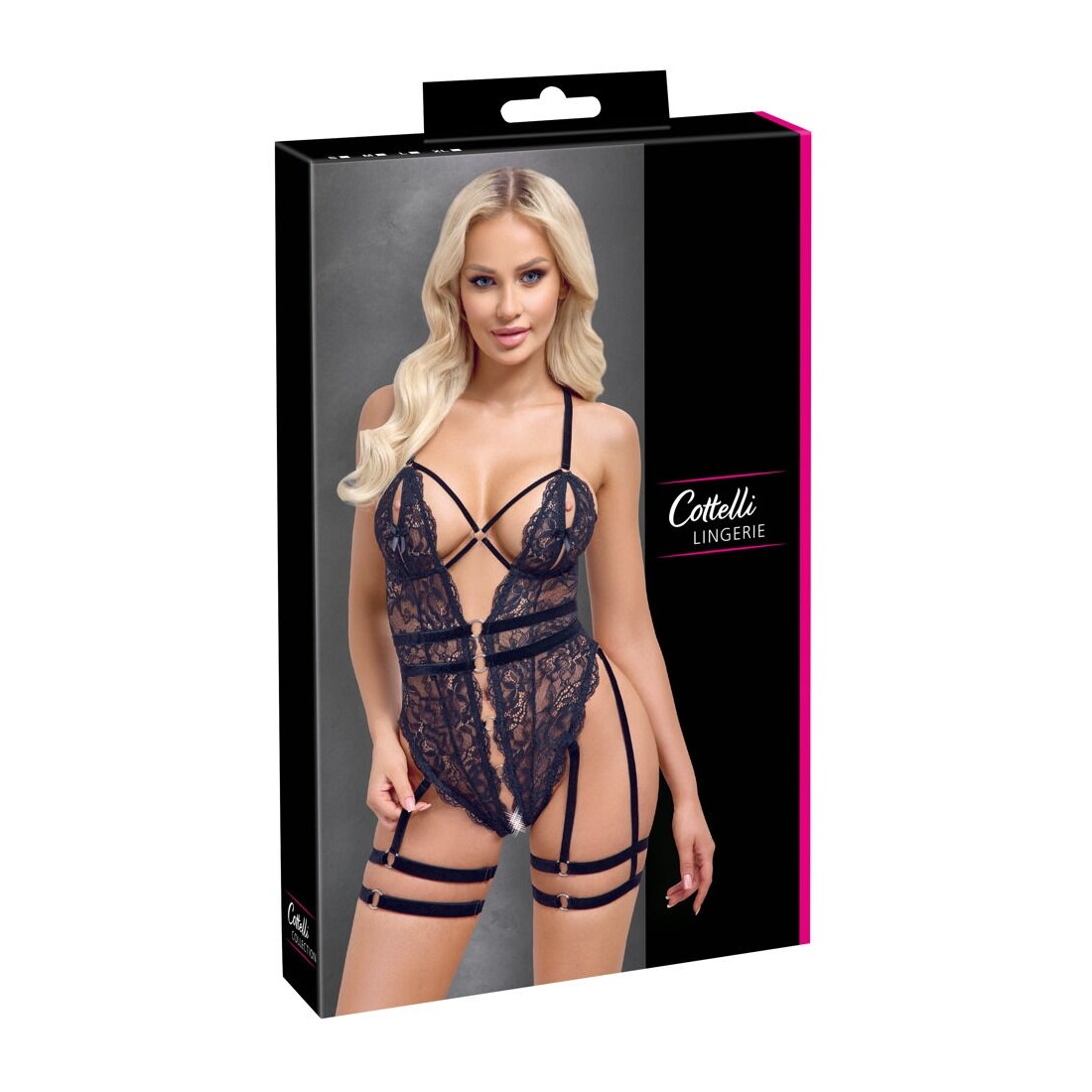 Body crotchless nero di Cottelli LINGERIE con reggicalze e bretelle (tutti rimovibili). Corpo in morbido pizzo floreale nero elasticizzato. Completamente aperto sul davanti, gli anelli decorativi color argento tengono saldamente insieme il tutto. Seducente anche l'apertura sul cavallo. Coppe in pizzo con piccole chiusure a gancio per l'apertura, spalline eleganti e anello. Spalline in velluto elasticizzato regolabili in vita. Anche le spalline e le cosce sono realizzate con cinghie di velluto elasticizzate e possono essere regolate per adattarsi. I gioielli per le cosce possono anche essere rimossi completamente insieme alle bretelle.