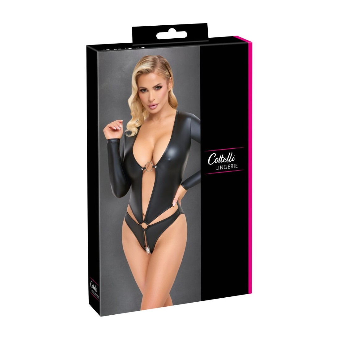 Body nero a maniche lunghe senza cavallo di Cottelli LINGERIE in un look opaco di tendenza. Uno stile rivelatore con una parte anteriore aperta, tenuta insieme da anelli e arricciata alla moda sul ventre. Completamente aperto sul cavallo, fino a sopra il sedere. Il materiale liscio, elastico e di tendenza è morbido e aderente alla pelle. Per il massimo comfort in qualsiasi posizione.