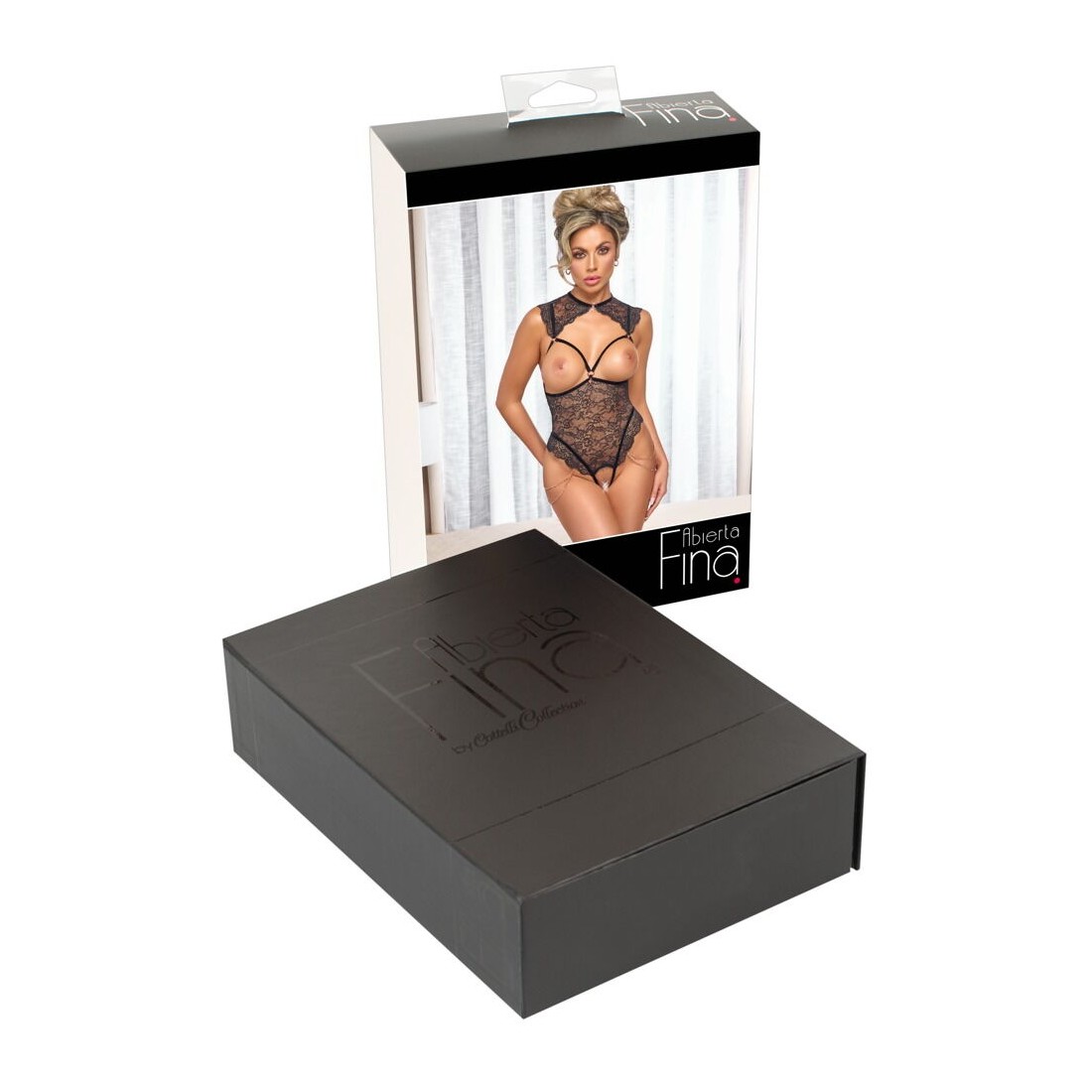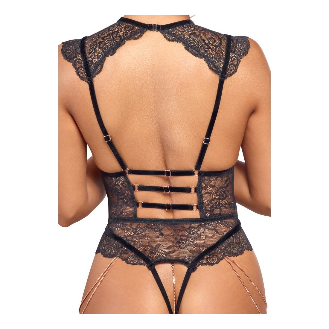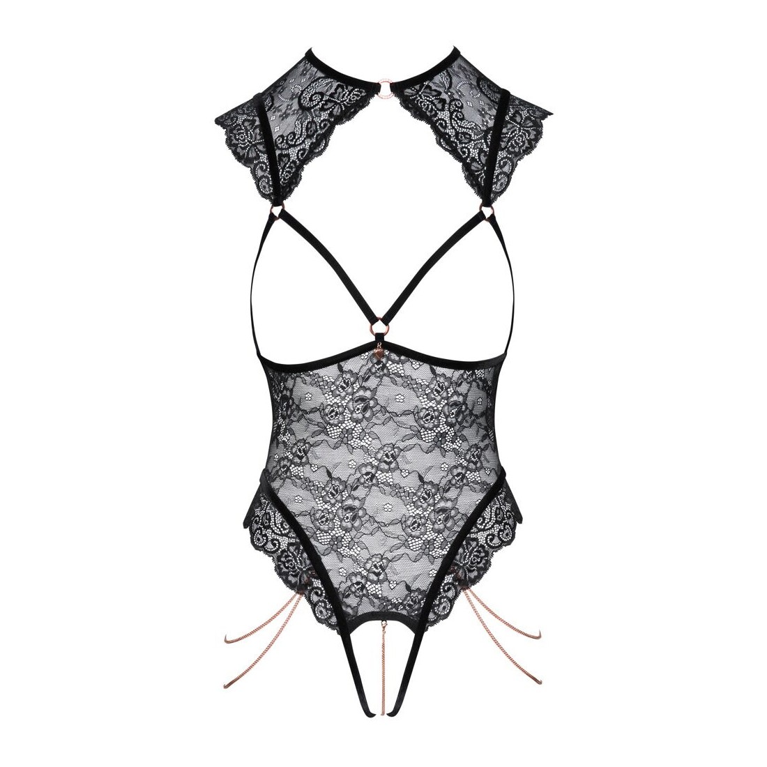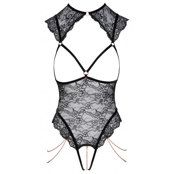 Body over nero di Abierta Fina in morbido pizzo floreale elasticizzato. Le spalline in velluto elasticizzato e gli accessori color oro rosa sottolineano il look elegante e rivelatore. Seducente senza seno e con pizzo che copre le spalle. Un anello di strass scintillante sulla parte anteriore del collo e una piccola chiusura a gancio sulla nuca. Un bellissimo ciondolo gioiello a forma di cuore tra le coppe aperte a fascia elastica. Due catene staccabili sulle cosce in corrispondenza dei tagli alti delle gambe. Anche la catena stimolante nel cavallo aperto è staccabile. Le spalline e le 3 fasce elastiche in velluto sulla schiena aperta possono essere regolate a piacere.