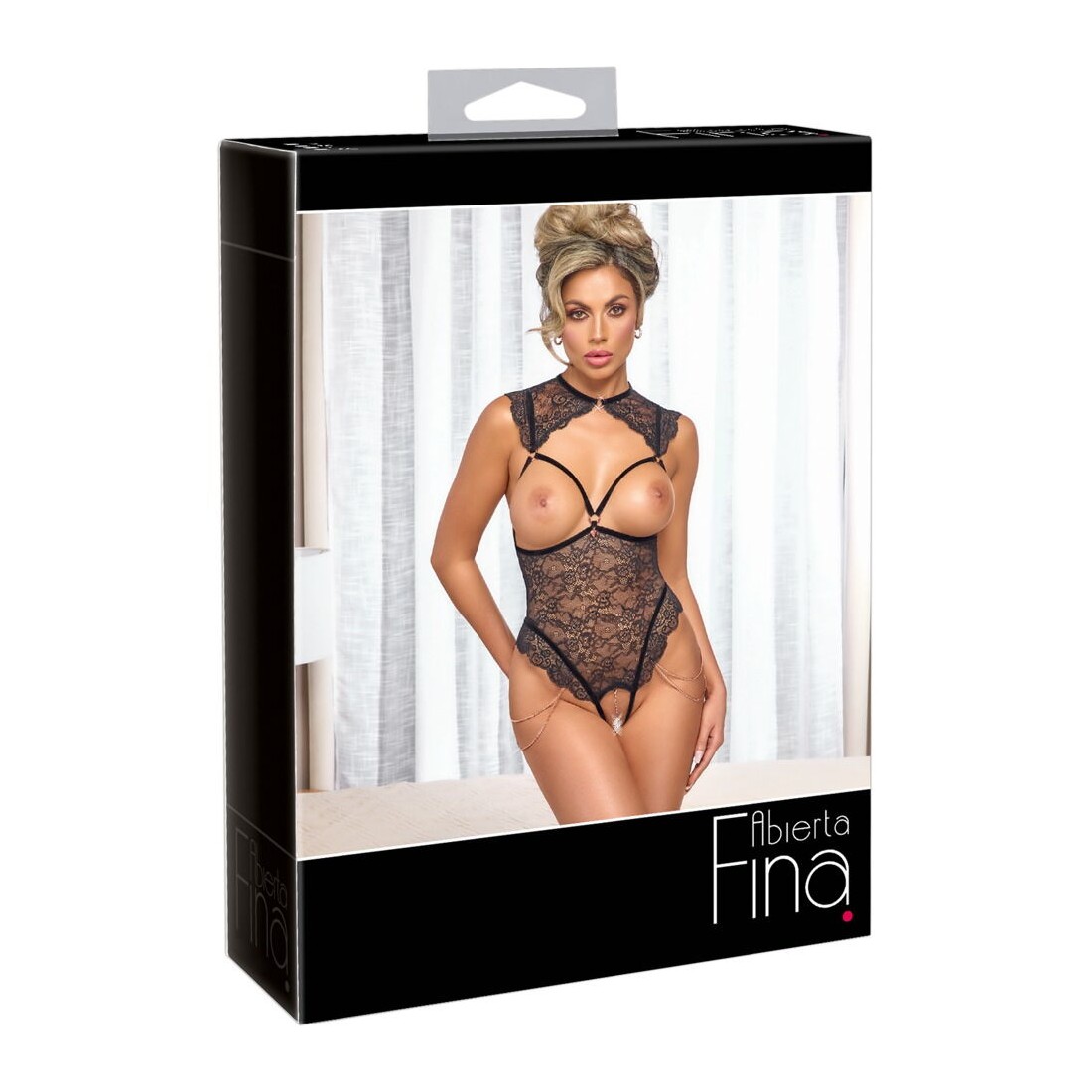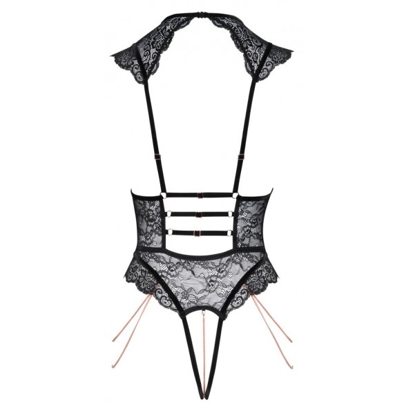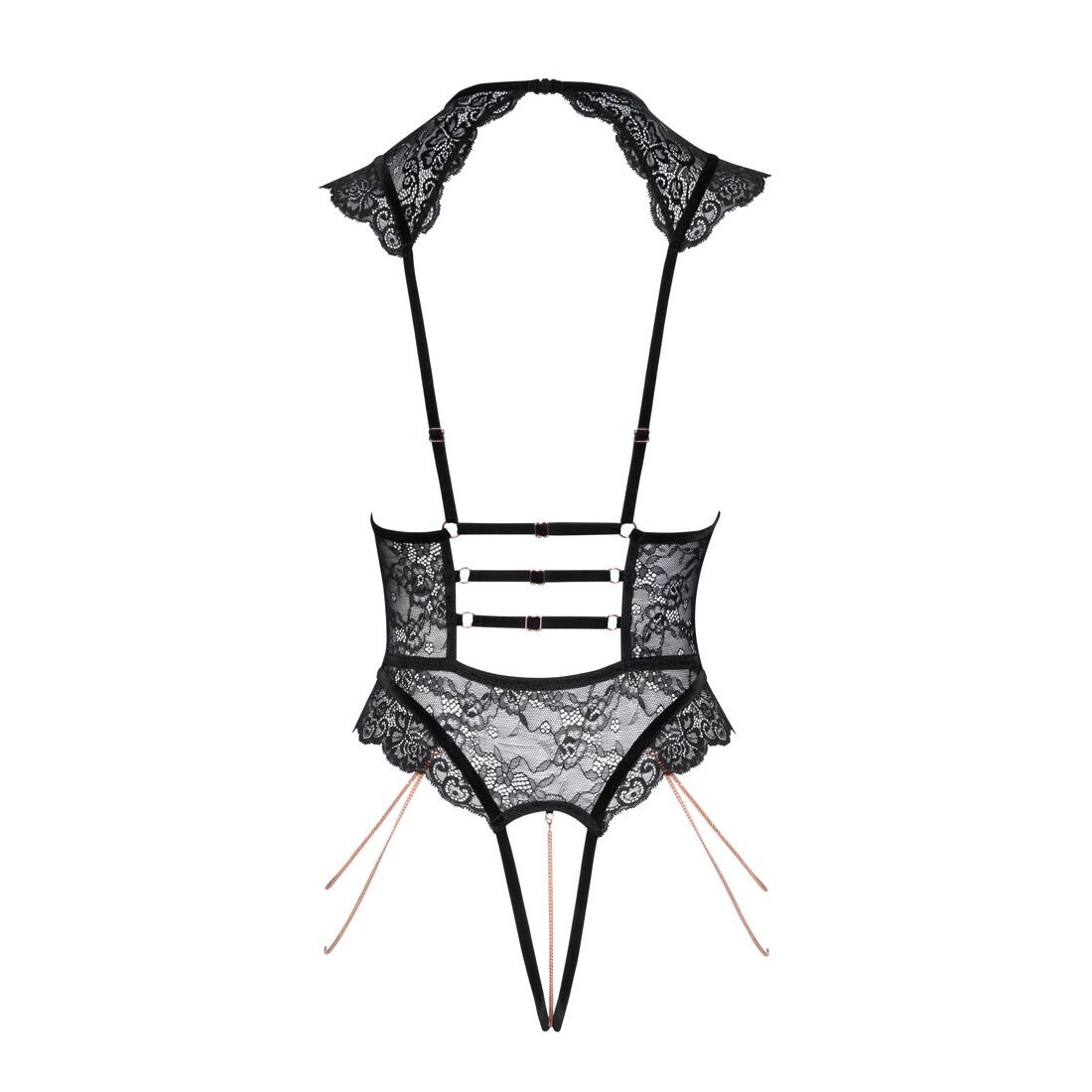 Body over nero di Abierta Fina in morbido pizzo floreale elasticizzato. Le spalline in velluto elasticizzato e gli accessori color oro rosa sottolineano il look elegante e rivelatore. Seducente senza seno e con pizzo che copre le spalle. Un anello di strass scintillante sulla parte anteriore del collo e una piccola chiusura a gancio sulla nuca. Un bellissimo ciondolo gioiello a forma di cuore tra le coppe aperte a fascia elastica. Due catene staccabili sulle cosce in corrispondenza dei tagli alti delle gambe. Anche la catena stimolante nel cavallo aperto è staccabile. Le spalline e le 3 fasce elastiche in velluto sulla schiena aperta possono essere regolate a piacere.