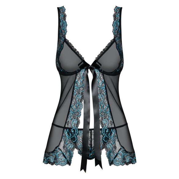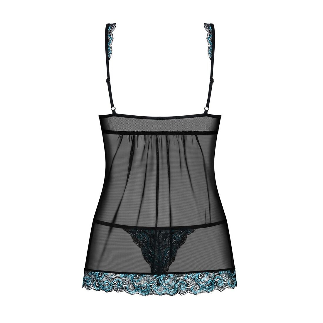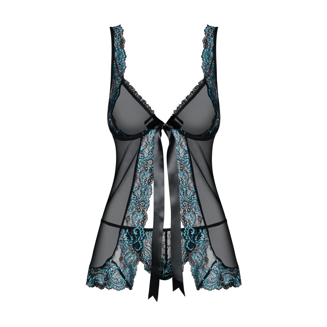 Il babydoll trasparente Amanta di Obsessive, con pizzo sul busto e sull'orlo, seduce con la parte anteriore aperta. Il perizoma coordinato è incluso.