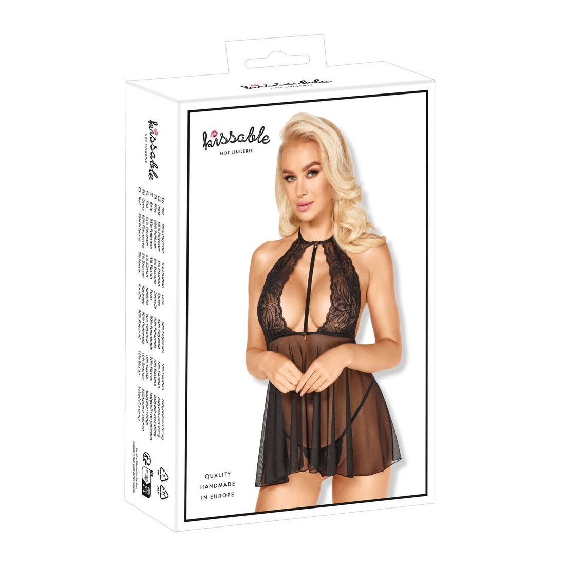 Babydoll corto e svasato di kissable in trasparenza nera, realizzato in splendido pizzo (top) e pregiato powernet (gonna). Morbido come la seta ed elastico per un elevato comfort di vestibilità. Sul davanti con una generosa scollatura dal collo alla fascia in vita, al centro una barra di nastro di raso come richiamo visivo. Anche il collo e la fascia in vita sono in raso, ciascuno decorato con un piccolo fiocco e una gemma scintillante sul davanti. Senza schienale, con collo a farfalla e chiusura al collo. Il piccolo perizoma in pizzo è incluso.