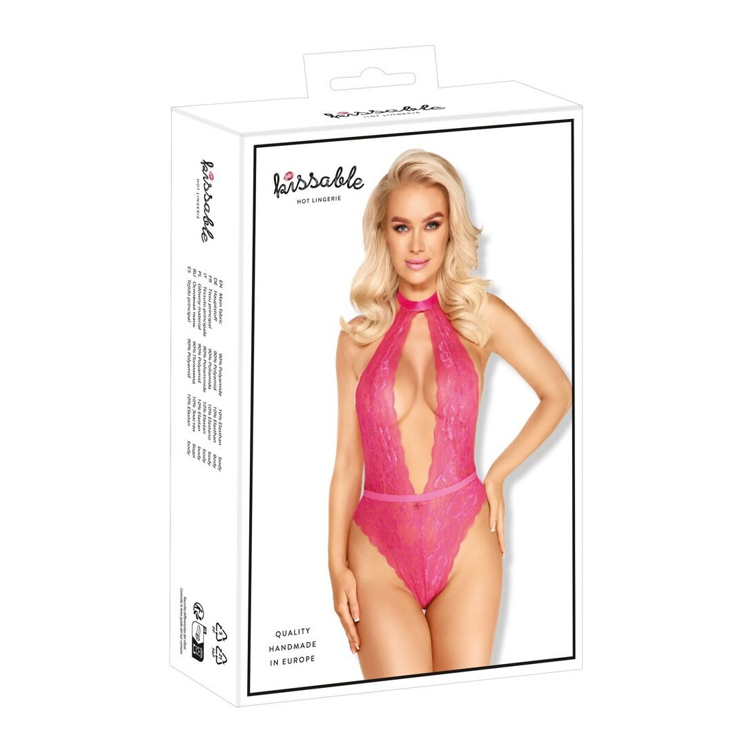 Body sfacciato e giocoso di kissable completamente realizzato in pregiato pizzo rosa. Morbido ed elastico su tutto il corpo per il massimo comfort. Stile seducente con ampio cut-out sul davanti dal collo alla vita. Senza schienale, il nastro di raso si lega al collo, così come il nastro di raso in vita nello scollo a V sopra lo slip.