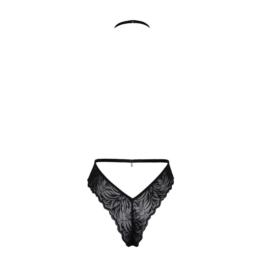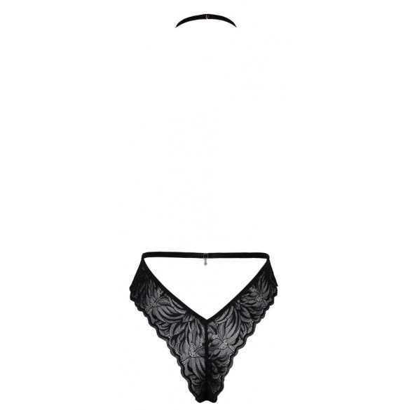 Seducente body di kissable completamente realizzato in pregiato pizzo nero. Morbido ed elastico su tutto il corpo per il massimo comfort. Stile backless con ampio cut-out sul davanti dal collo alla vita. Scollatura con fiocco e pietre glitterate sul davanti e chiusura a gancetto sul collo. Fascia in vita con fiocco e pietre glitterate sul retro e chiusura a gancetto laterale.