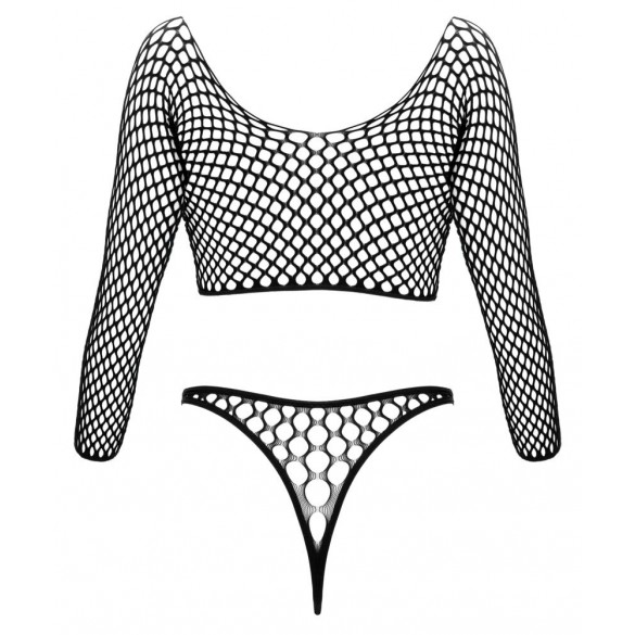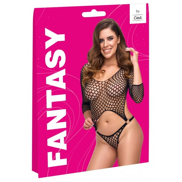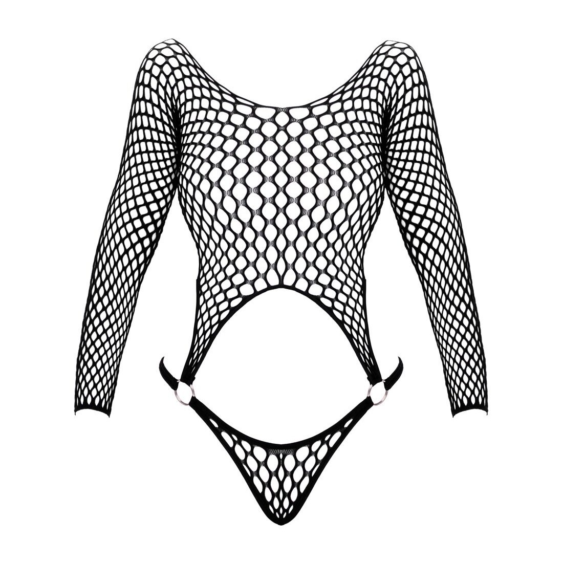 Body nero a rete di Fantasy by Cottelli con maglie larghe alla moda. In un sofisticato look a due pezzi, con il top a maniche lunghe e il perizoma saldamente collegati sul davanti con 2 anelli decorativi color argento. I tagli alti sulle gambe evidenziano perfettamente il sedere e le gambe. Altamente elasticizzato e morbido su tutta la superficie per un comfort ottimale.