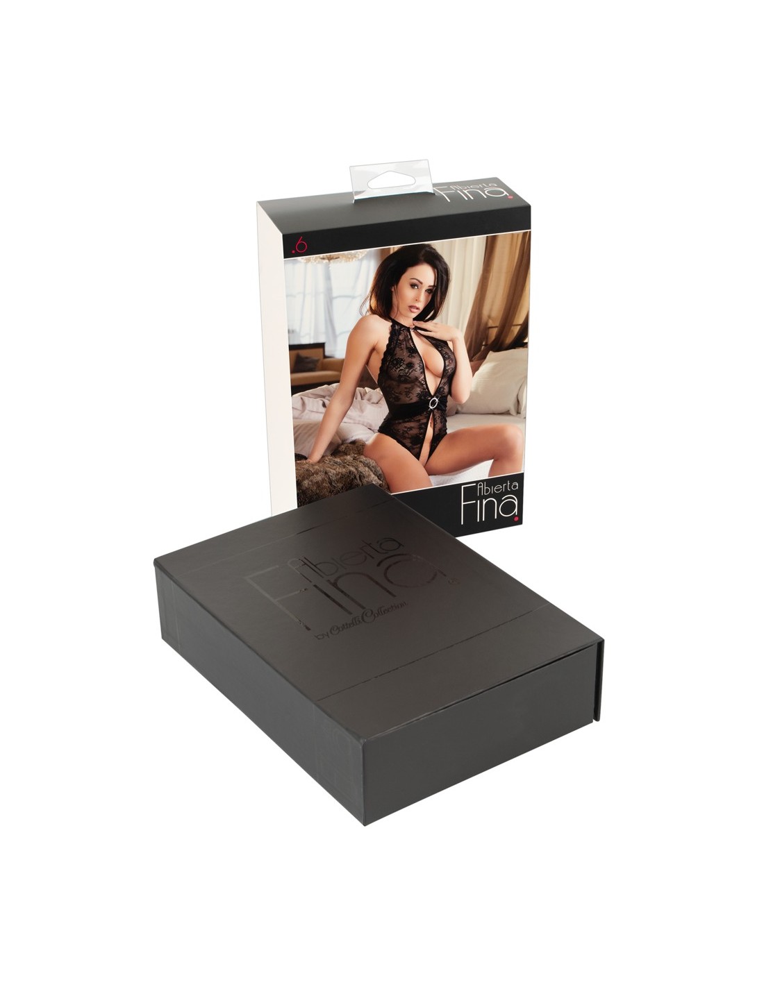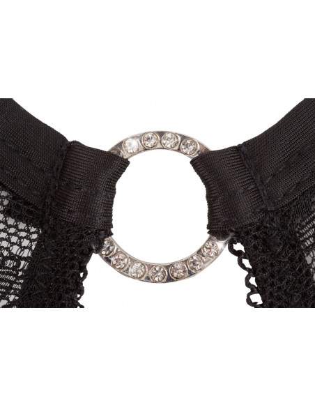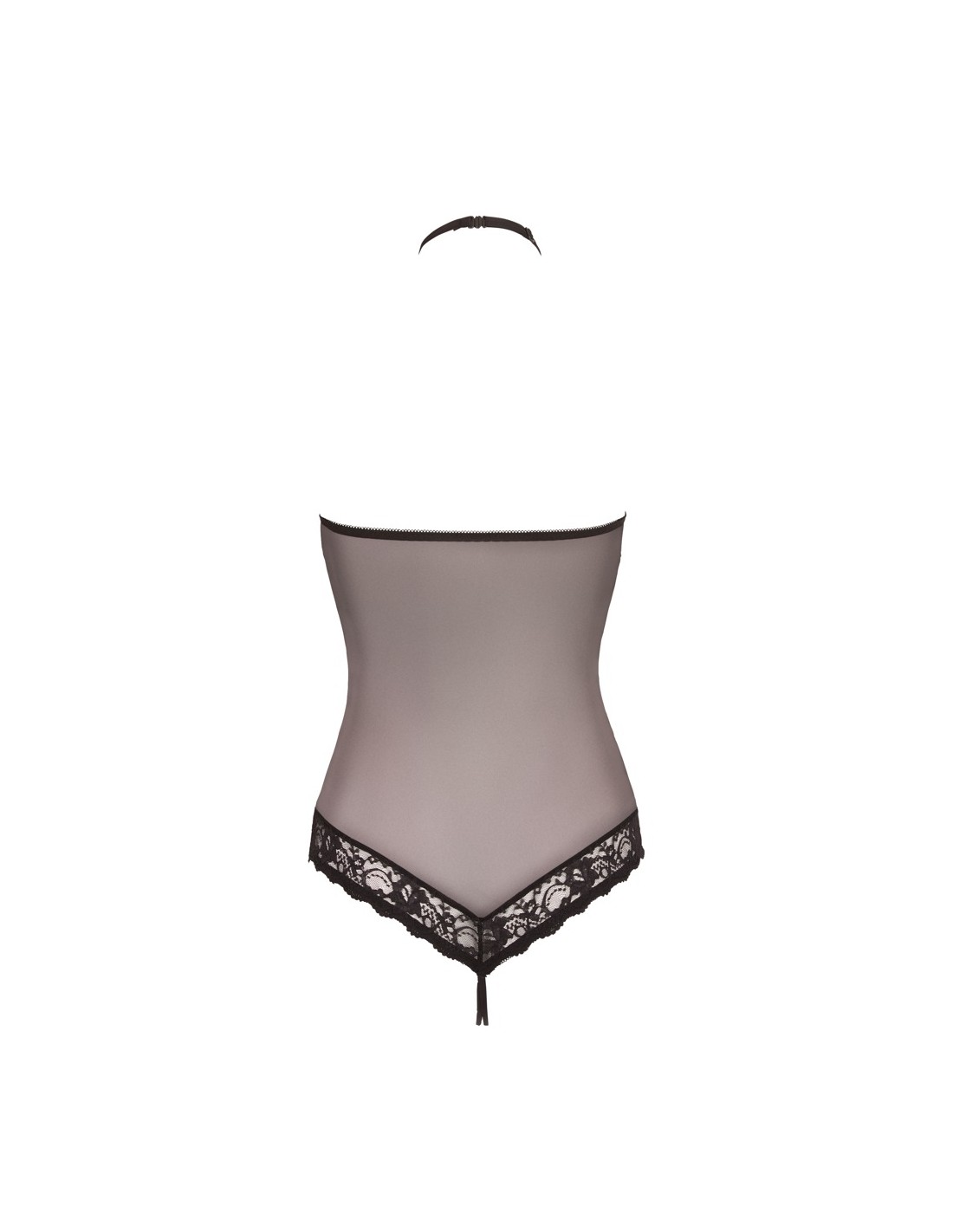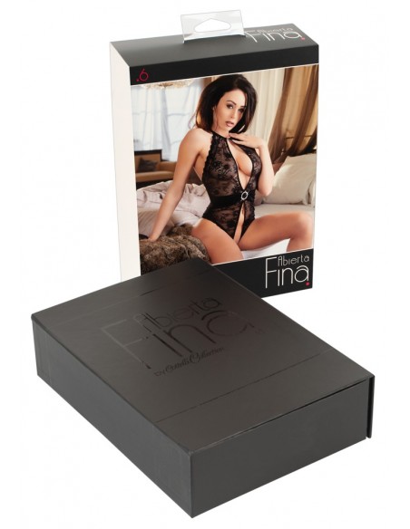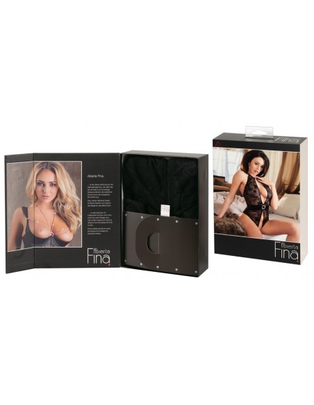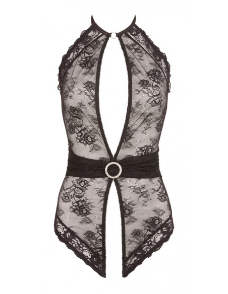 Sexy intimo femminile della linea Abierta Fina. Body a perizoma con apertura al cavallo e anello di strass sull' addome posizionato su finta cintura. Allacciatura con anello sul collo. Erotico ed elgante di colore nero in pizzo con la parte posteriore in tessuto trasparente e pizzo sopra. TAGLIA M.
