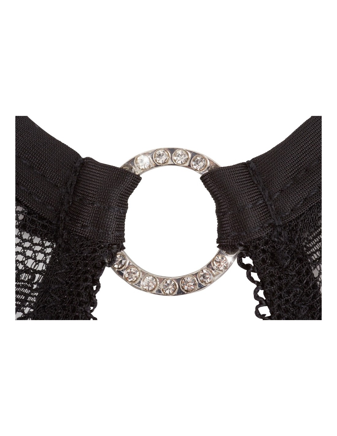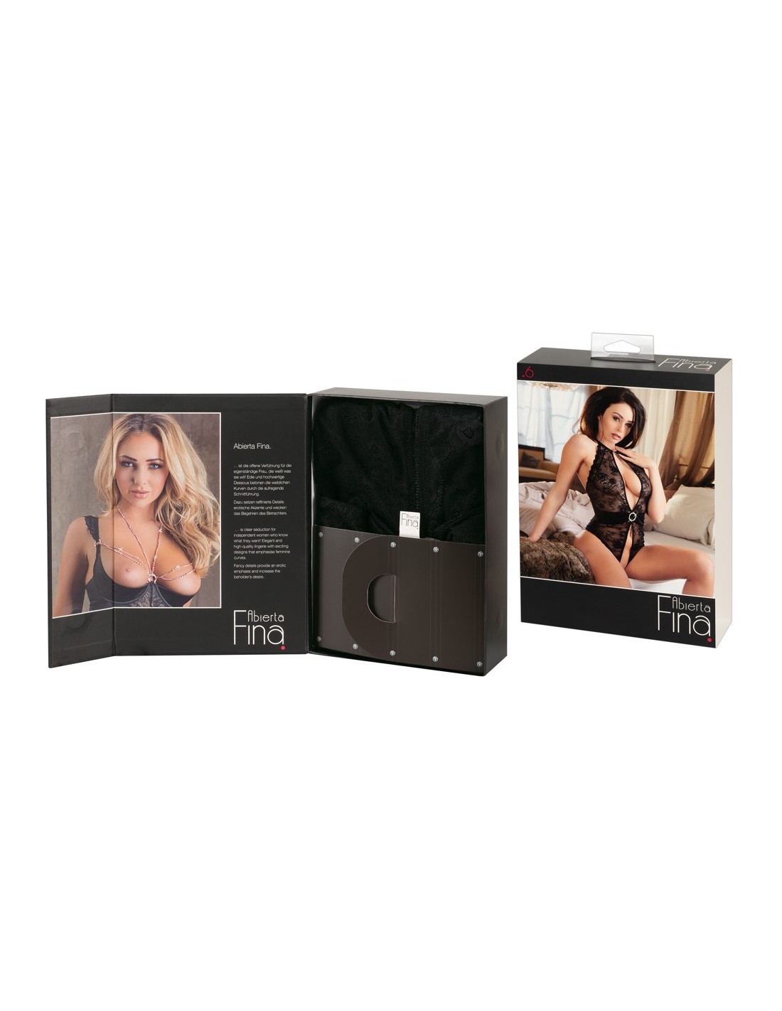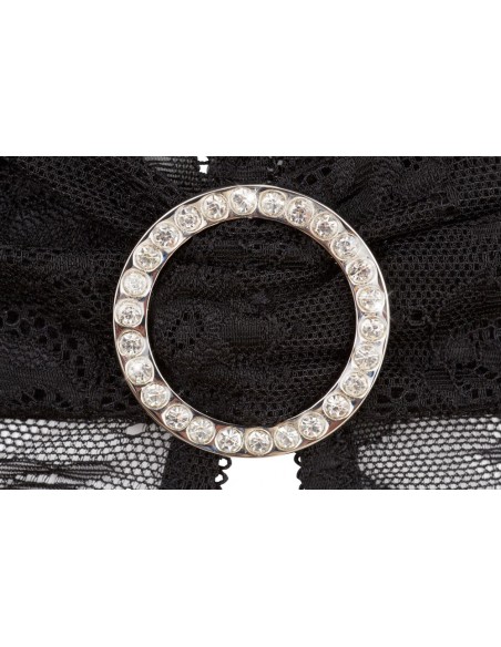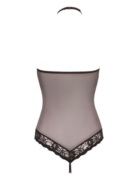 Sexy intimo femminile della linea Abierta Fina. Body a perizoma con apertura al cavallo e anello di strass sull' addome posizionato su finta cintura. Allacciatura con anello sul collo. Erotico ed elgante di colore nero in pizzo con la parte posteriore in tessuto trasparente e pizzo sopra. TAGLIA M.