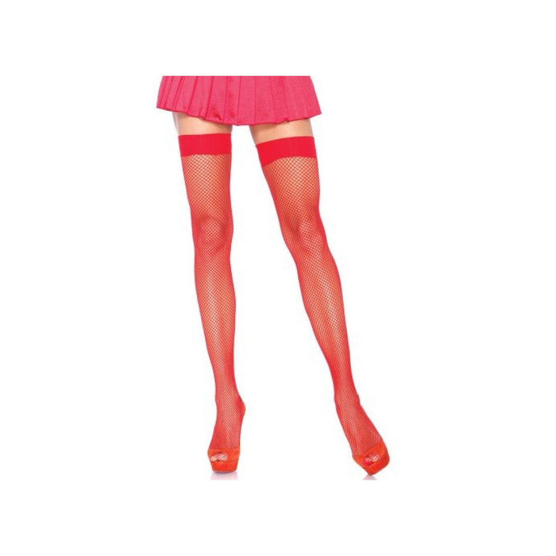 Calze rosse a rete di piccola trama con fascia autoreggente. Misura unica vestibile dalla taglia 40 alla taglia 46.