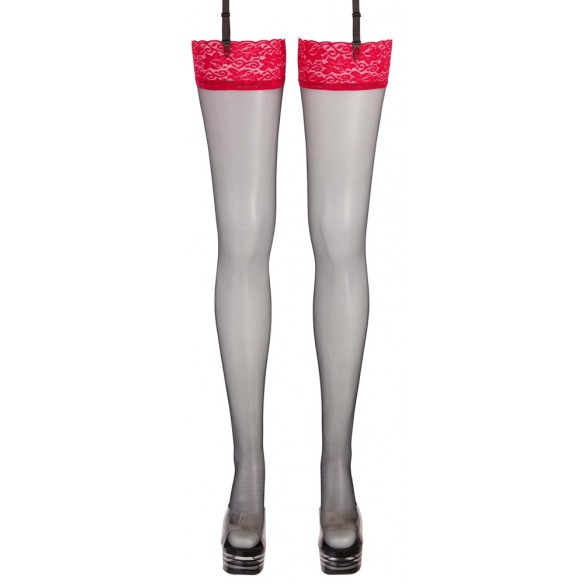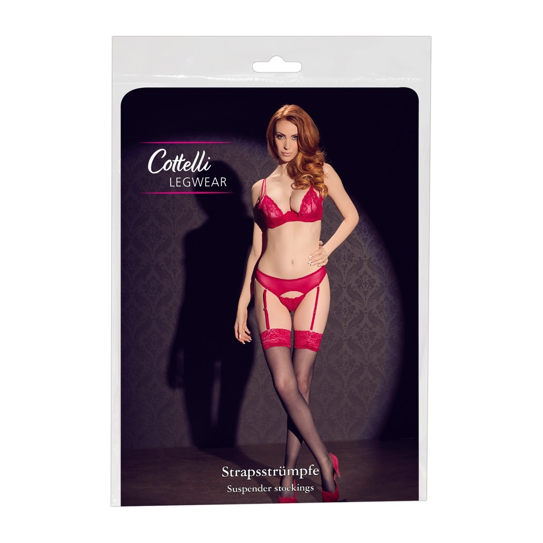 Sensuali reggicalze con pizzo rosso da agganciare. 20 den. Piede leggermente preformato. Certificato Oeko-Tex.