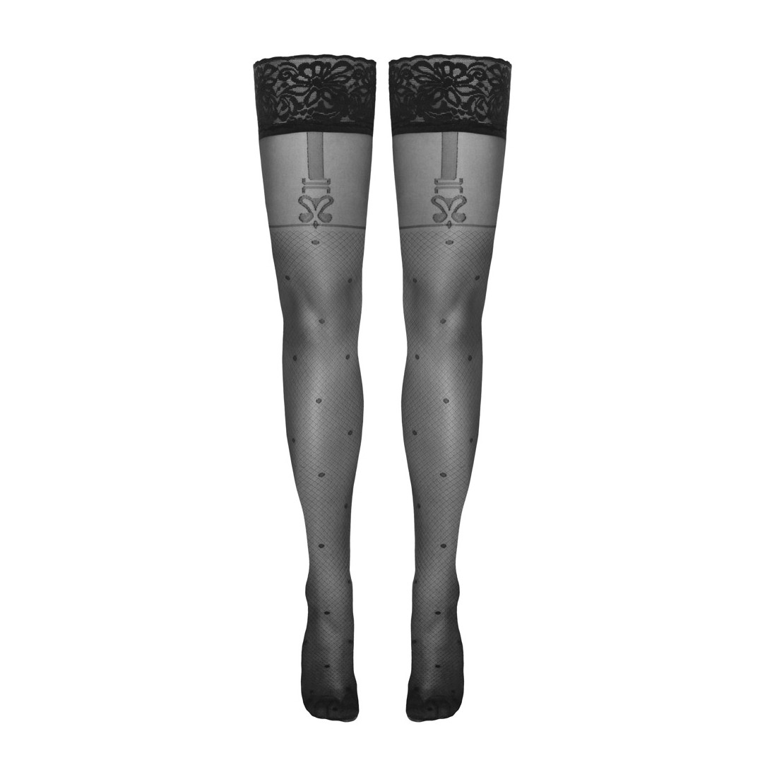 Calze autoreggenti nere di Cottelli LEGWARE in delicato design a rete con pois e bretelle intrecciate. Bellissimo bordo in pizzo largo 8 cm con rinforzo in silicone all'interno per una vestibilità perfetta e antiscivolo. Piedi leggermente preformati. Peso del filato 40 den. Certificato Oeko-Tex.