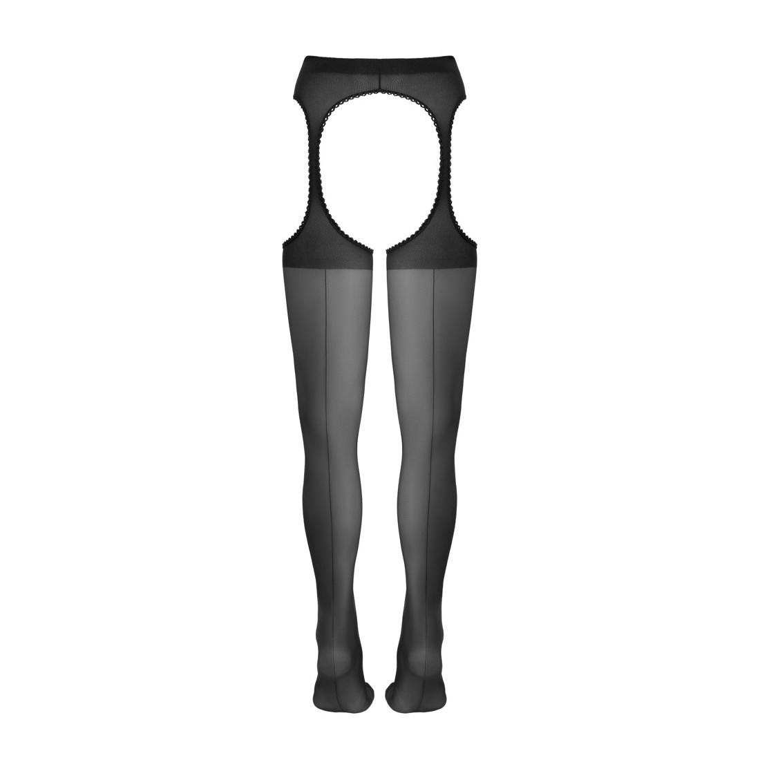 Calze per reggicalze nere di Cottelli LEGWARE con cucitura decorativa sulla parte posteriore della gamba. Parte della mutandina rinforzata con cavallo aperto e ritagli sui lati. Tutte le aperture sono bordate con pregiate rifiniture in pizzo. Piedi preformati. Peso del filato 20 den. Certificato Oeko-Tex.