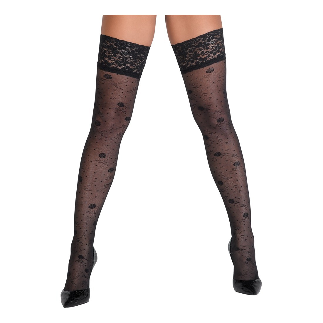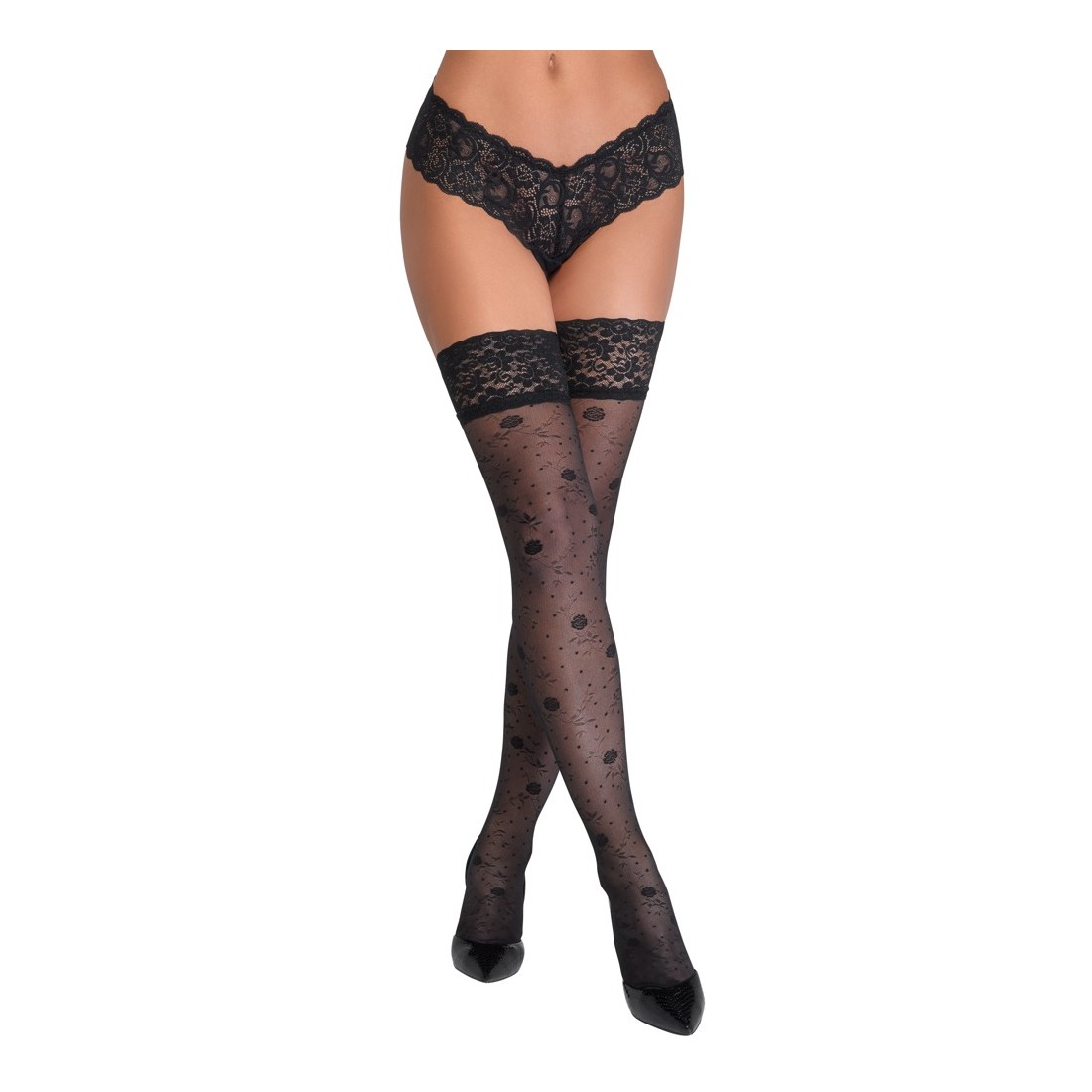 Calze autoreggenti nere di Cottelli LEGWARE con delicata fantasia di rose. Con bordo in pizzo largo 9 cm e rinforzo in silicone per una vestibilità antiscivolo e un sostegno ottimale. Piede leggermente preformato. Peso del filato 20 den. Certificato Oeko-Tex.