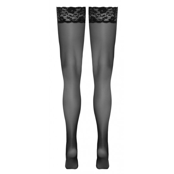 Calze nere autoreggenti di Cottelli LEGWARE con un bellissimo top in pizzo largo 9 cm. Interno con rinforzo in silicone per una vestibilità antiscivolo e una tenuta ottimale. Misura del filo 20 den. Certificato Oeko-Tex.