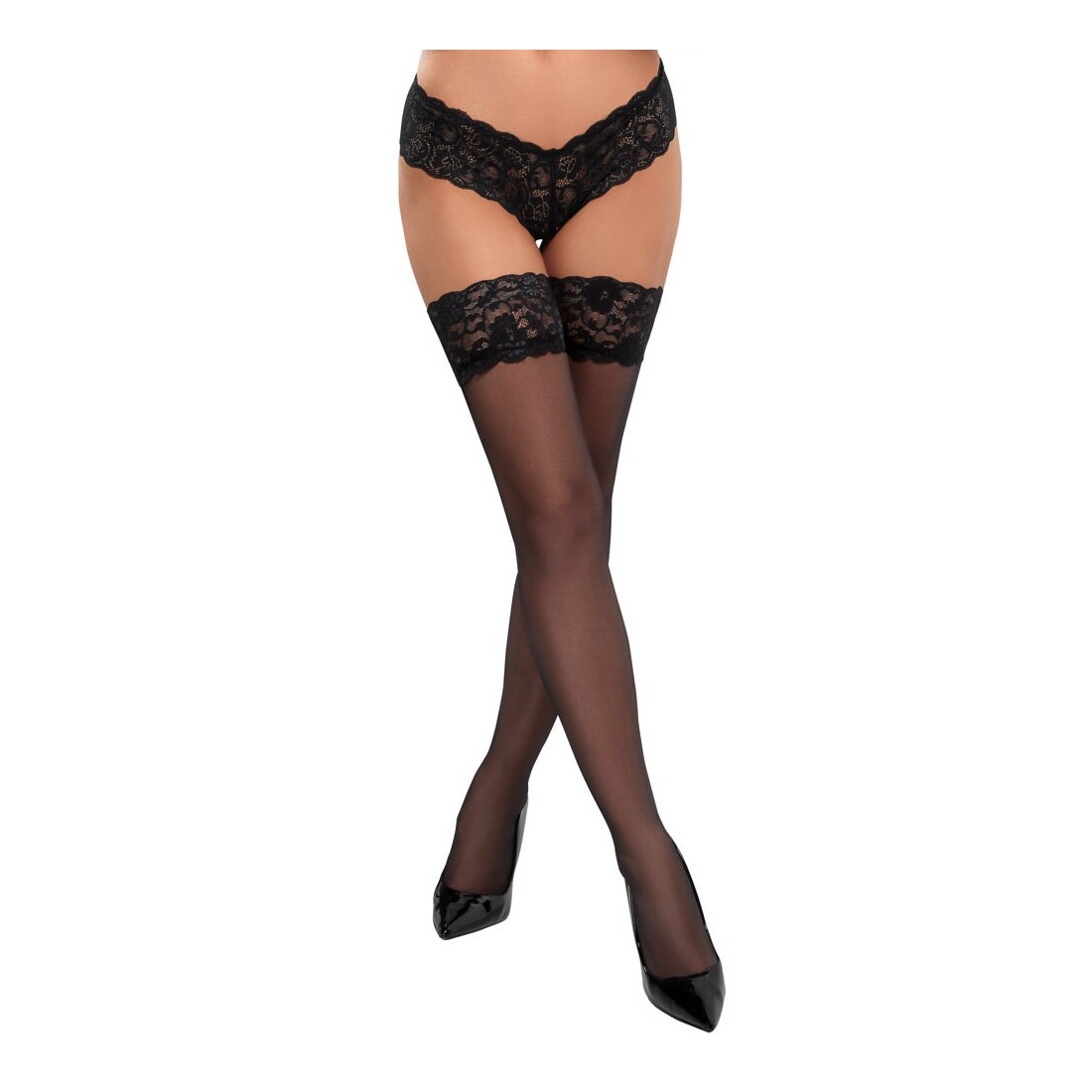 Calze nere autoreggenti con un bellissimo top in pizzo largo 9 cm. M