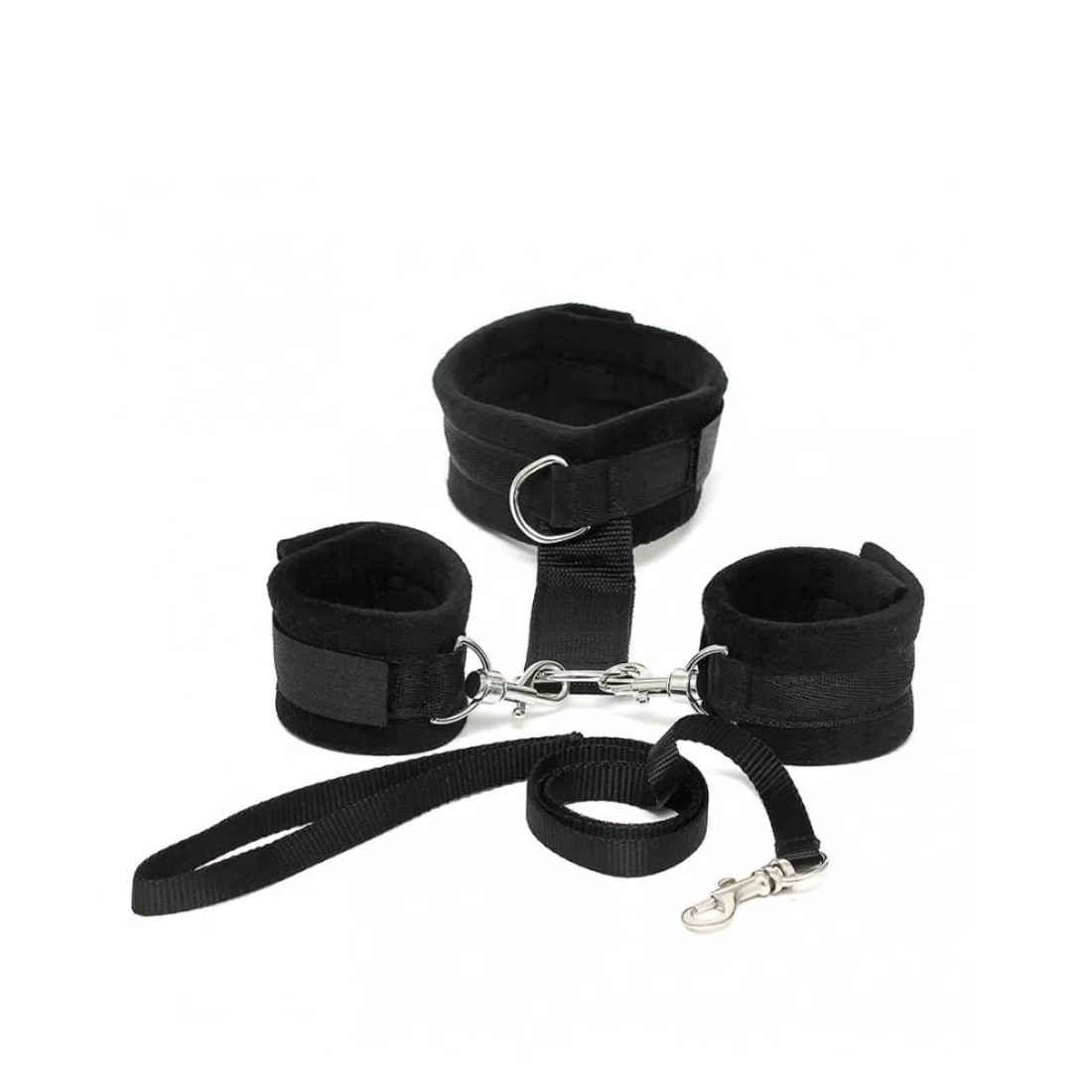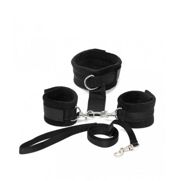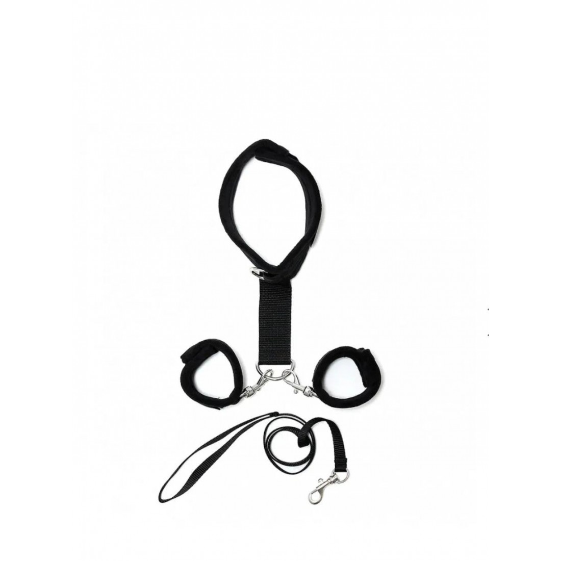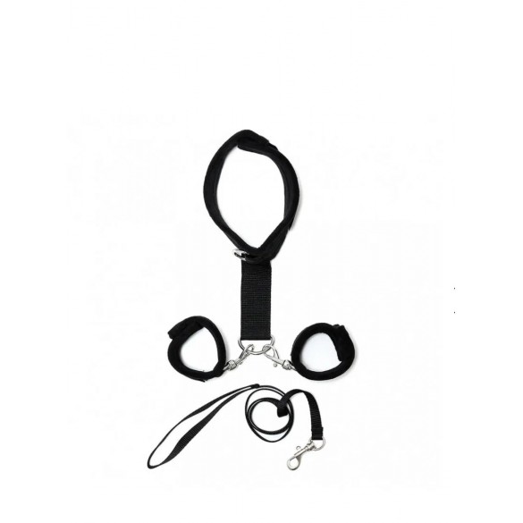 Collare bondage morbido fissato a una cinghia corta e collegato alle manette tramite chiusura in velcro. Il collare è dotato di guinzaglio staccabile.