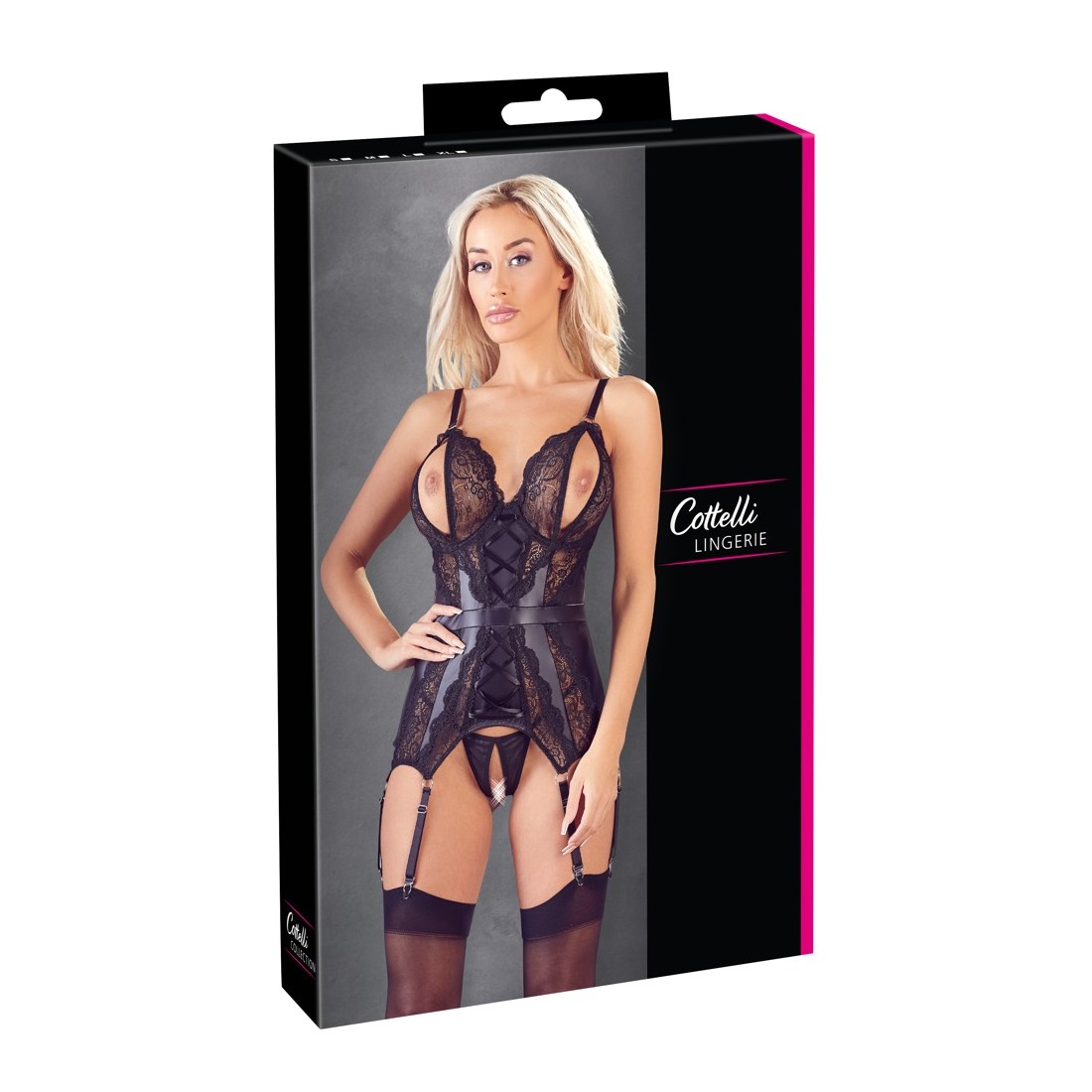 Seducente reggicalze in tessuto opaco con 3 supporti regolabili per lato e coppe a fessura. Finito con amore e nella parte anteriore con elaborati inserti in pizzo e allacciatura decorativa. La cintura in vita cucita sottolinea le curve femminili. È incluso anche il cordino del cavallo aperto corrispondente. Senza calze.