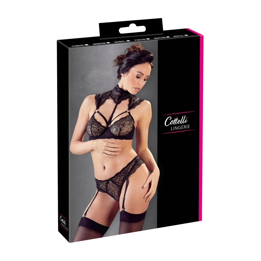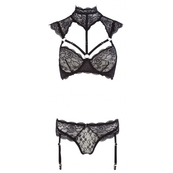 Sensuale reggiseno con ferretto in pizzo di fiori con anelli decorativi e spalline regolabili al collo. Le spalline regolabili affascinano con delicati dettagli in pizzo che convergono sulla clavicola per formare un ampio collare. Con chiusura a gancio sul retro e 2 bottoni come chiusura a collare. Il perizoma in pizzo abbinato ha bretelle regolabili e rimovibili.