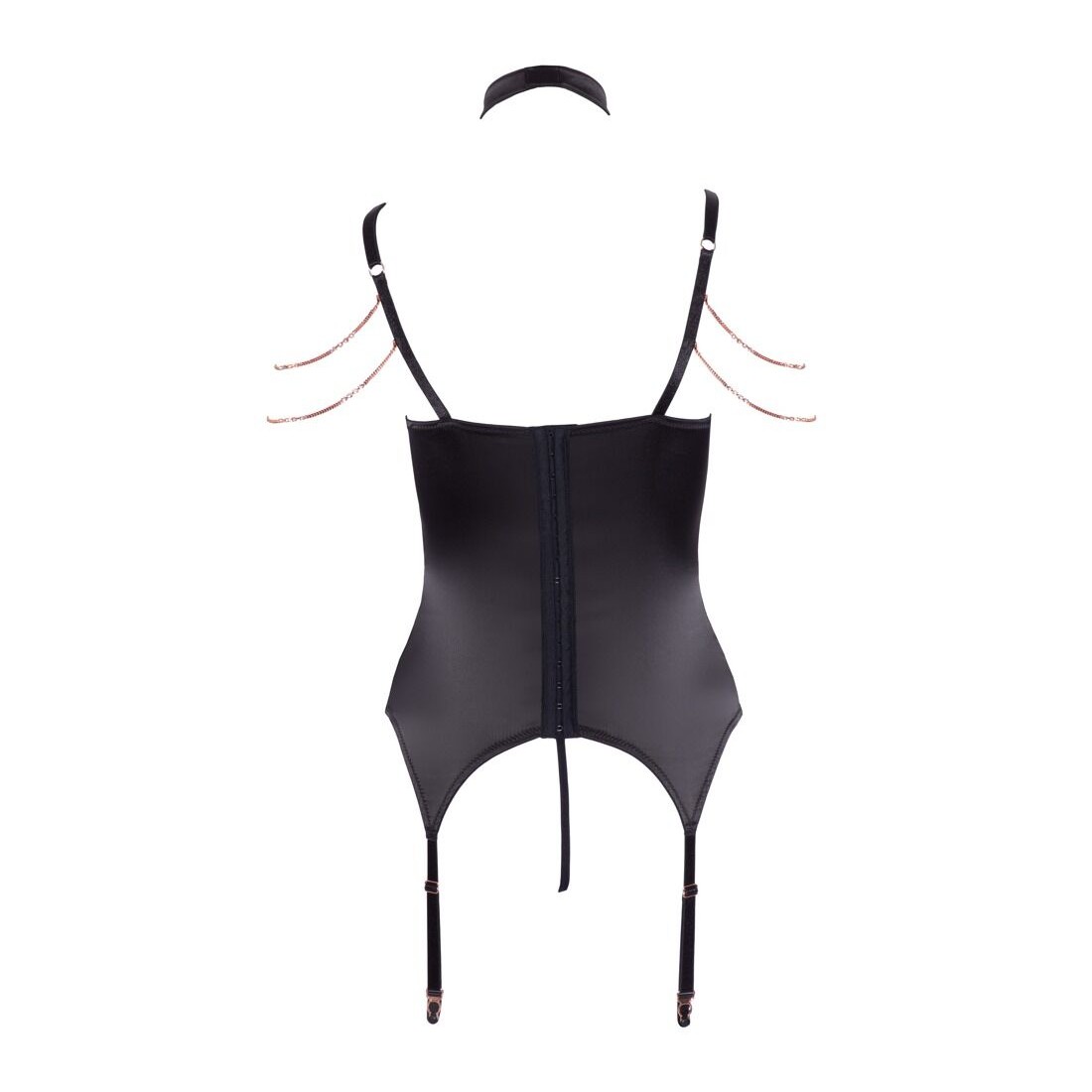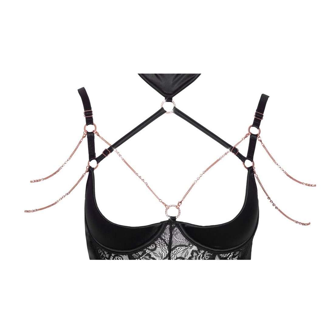 Sensazionale chemise con reggicalze di Abierta Fina in raso elastico, con inserti di pizzo che guidano la silhouette sul davanti e guarniti con elementi di gioielleria color oro rosa. Il ferretto incorporato con coppe leggermente imbottite mette il busto in ottima forma e direttamente sotto i riflettori. Le due spalline regolabili del décolleté che portano dalle spalline regolabili al collare con chiusura in velcro sono sofisticate. Le catene decorative con strass sul petto e sulle spalle sono dotate di piccoli moschettoni e sono quindi rimovibili. Nella parte posteriore con chiusura a gancio. Le giarrettiere sono regolabili in lunghezza. Il piccolo perizoma ouvert in raso elastico con la catena staccabile nel cavallo aperto è incluso.