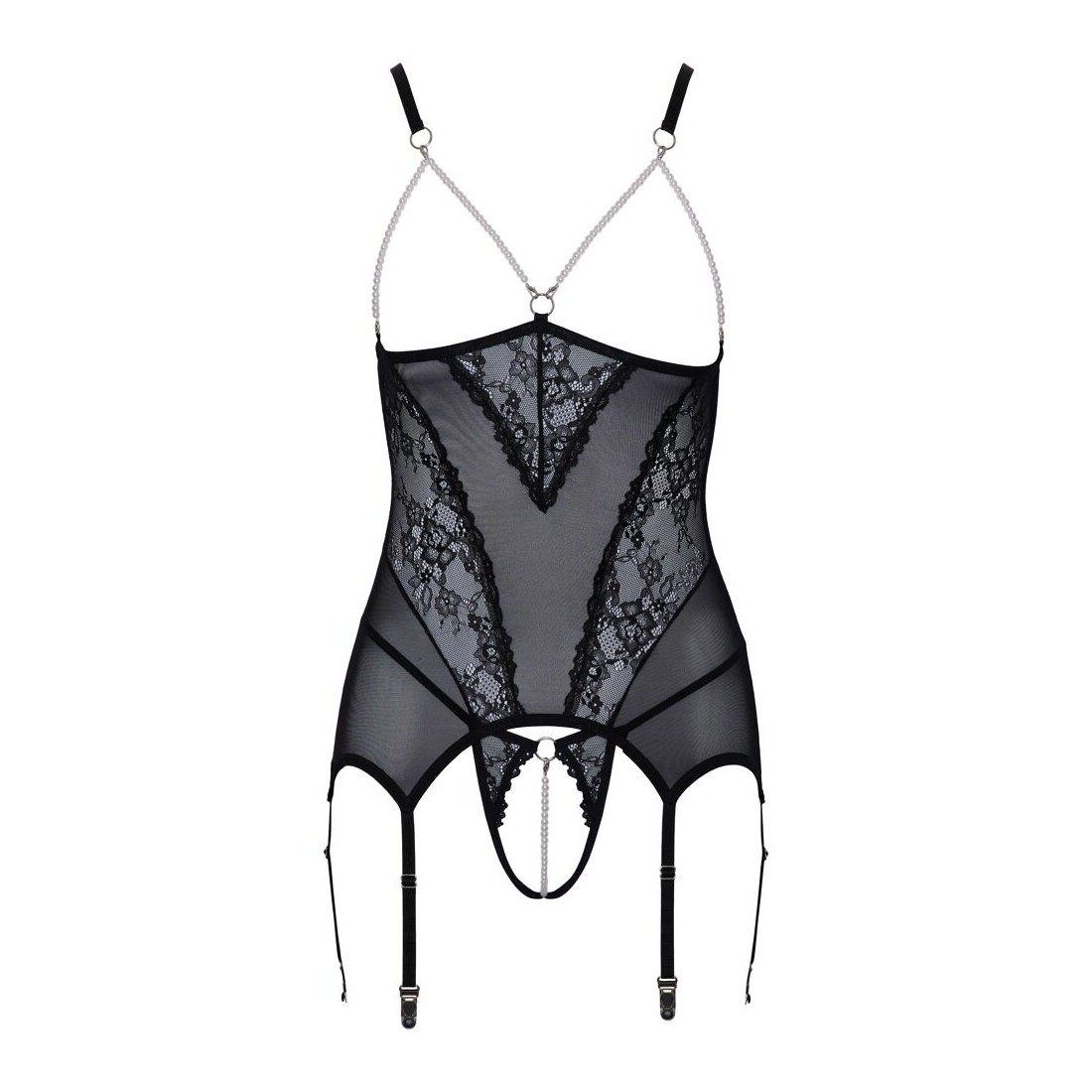 Chemise con reggicalze e perizoma nero senza cavallo di Cottelli LINGERIE. Realizzato in pregiato powernet con delicati inserti in pizzo sul davanti. Morbido ed elastico su tutto il perimetro per un elevato comfort di utilizzo. Catene di perle bianche incorniciano in modo seducente i seni nudi e sono agganciate ad anelli decorativi con i loro moschettoni. Le spalline sono regolabili sulla schiena libera. Sul retro, la chemise con bretelle si chiude con un gancio. Le 6 bretelle sono regolabili in lunghezza. Il perizoma coordinato con pizzo aperto sul davanti è dotato di una stimolante catena inguinale rimovibile.