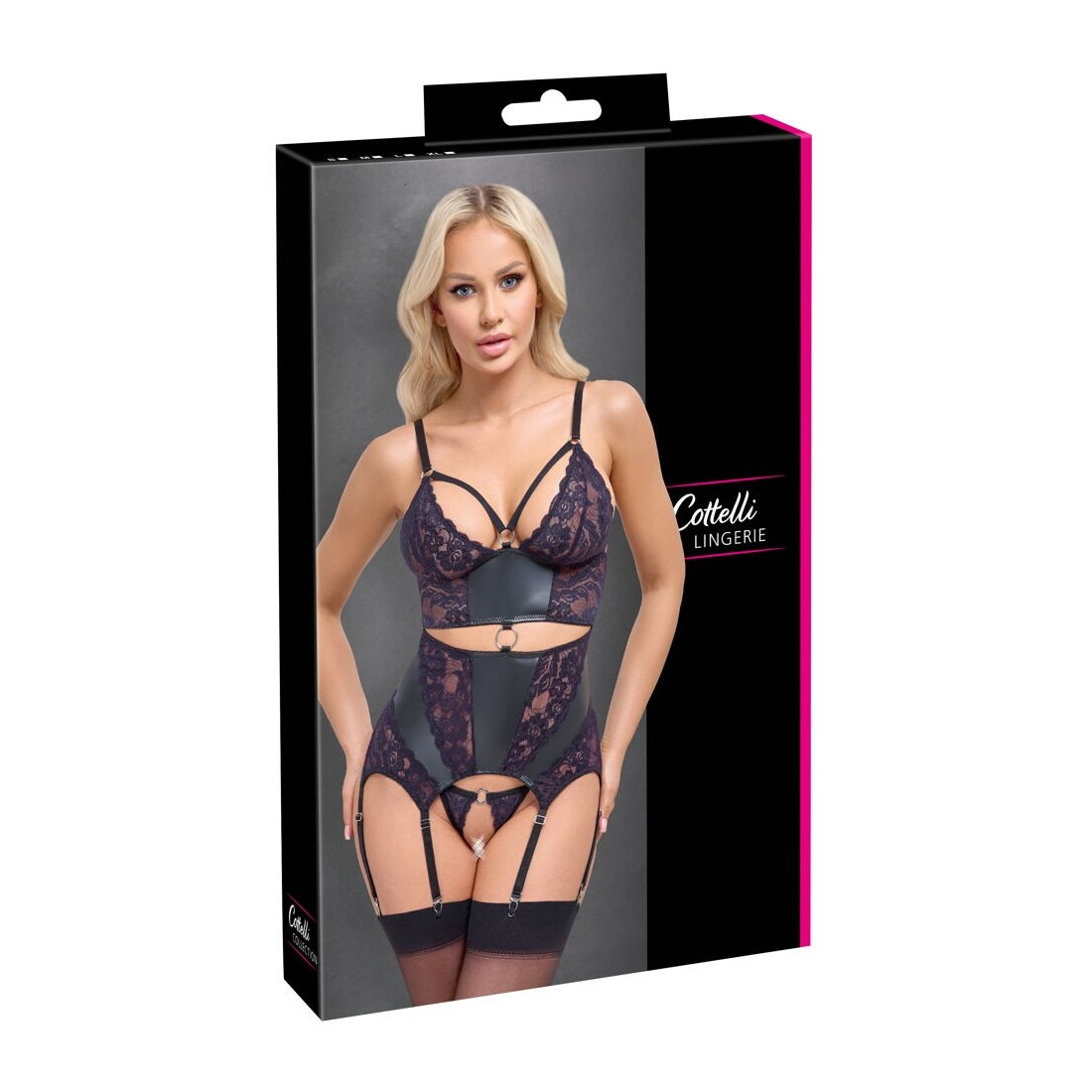 Top con reggicalze e perizoma inguinale di Cottelli LINGERIE. In look nero opaco, con inserti di pizzo in un sofisticato colore viola scuro sul davanti. Morbido ed elasticizzato su tutta la superficie per un comfort totale. Con spalline elastiche decorative e un anello tra le coppe in morbido pizzo. Un anello color argento si trova anche nell'apertura sul davanti e nella fascia in vita. Le spalline e un totale di 6 bretelle sono regolabili. Così come la chiusura a doppio gancio sul retro. La piccola stringa è seducentemente aperta all'inguine.