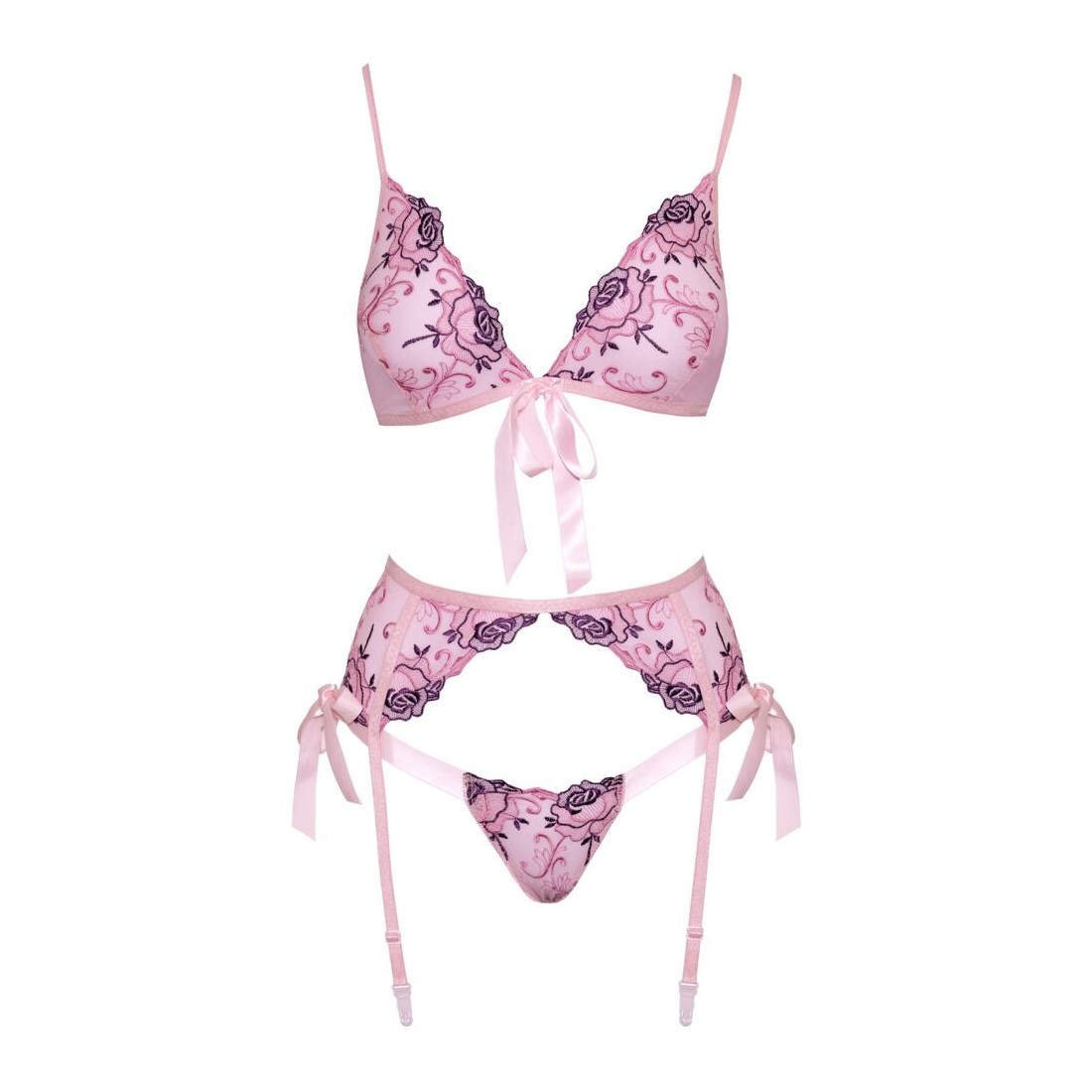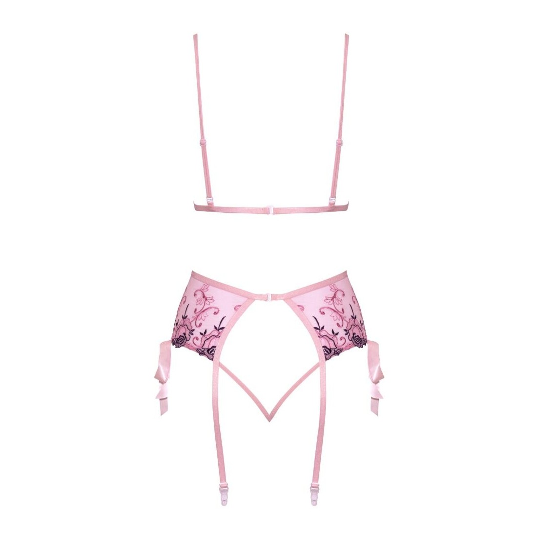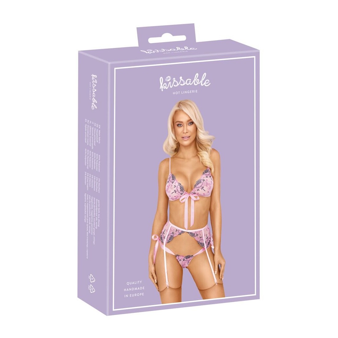 Morbido set reggiseno, reggicalze e perizoma di kissable realizzato interamente in pregiato powernet rosé con intricati ricami floreali tono su tono. Morbido ed elastico su tutto il perimetro per il massimo comfort. Reggiseno morbido sul davanti e perizoma con fiocco laterale in raso. Reggiseno con chiusura a clip sulla schiena, le spalline sono regolabili. Reggicalze con chiusura a gancio sul retro e bretelle regolabili. Il piccolo perizoma seduce con le sue due strette fasce elastiche che si uniscono all'inguine.