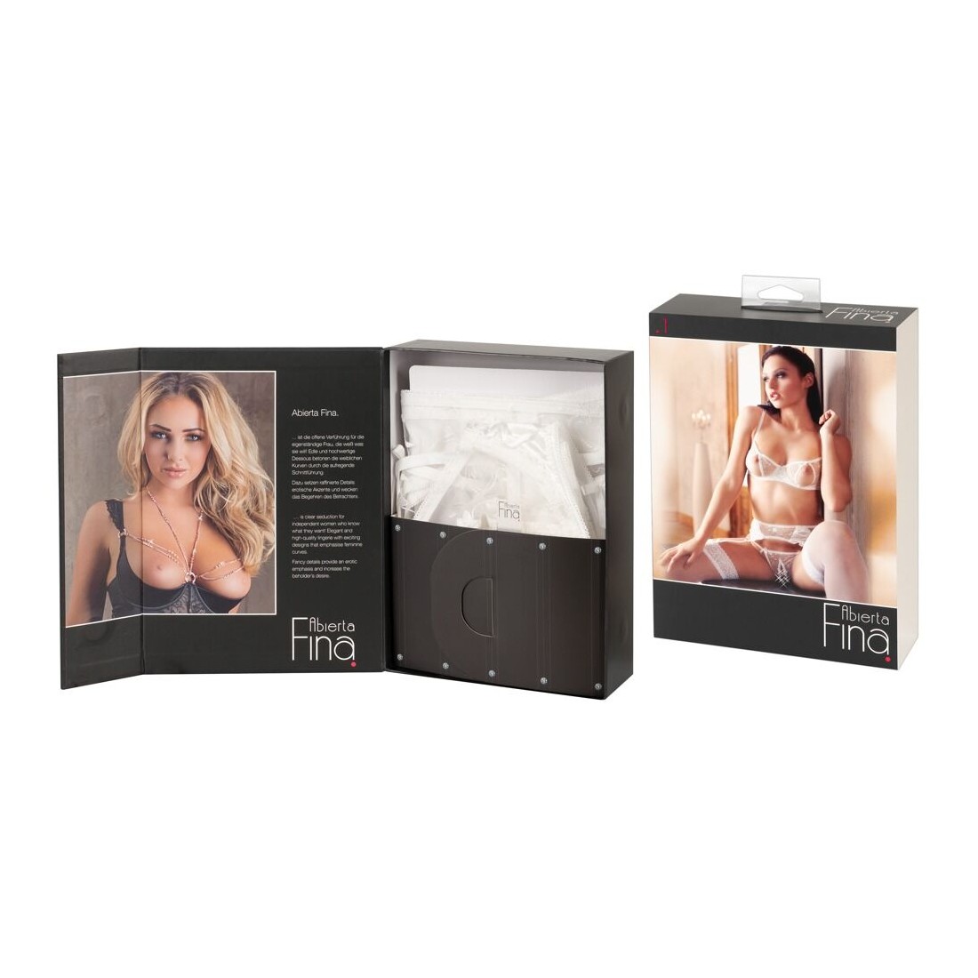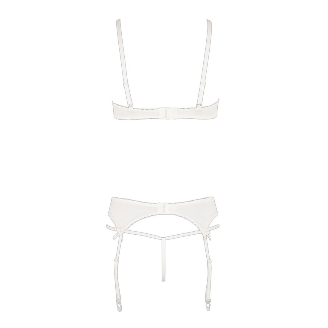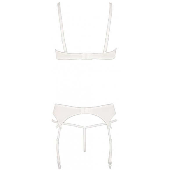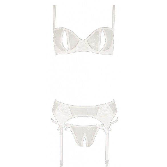Set delicato fatto di maglia fine ricamata in combinazione con raso elastico e piccole allacciature decorative. Reggiseno con ferretto con coppe a spacco e spalline regolabili. Reggicalze con bretelle regolabili, chiusura a gancio sul retro. Perizoma abbinato con cavallo aperto.