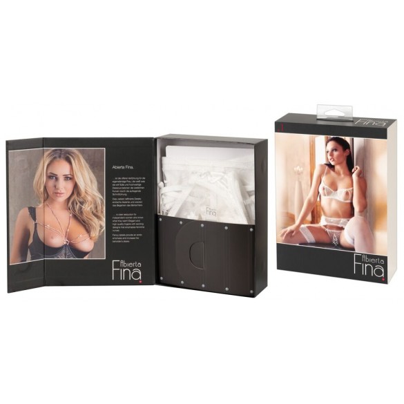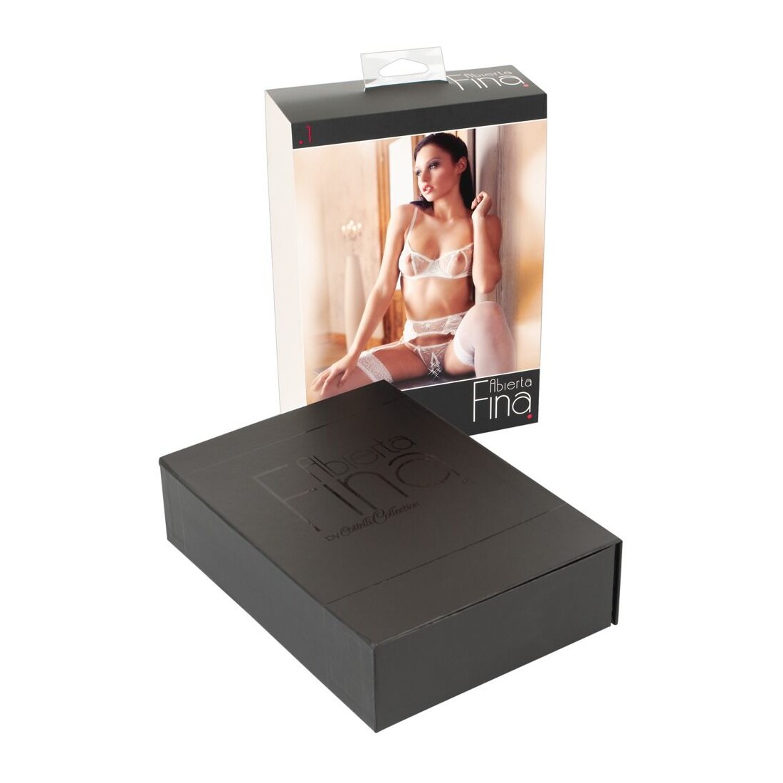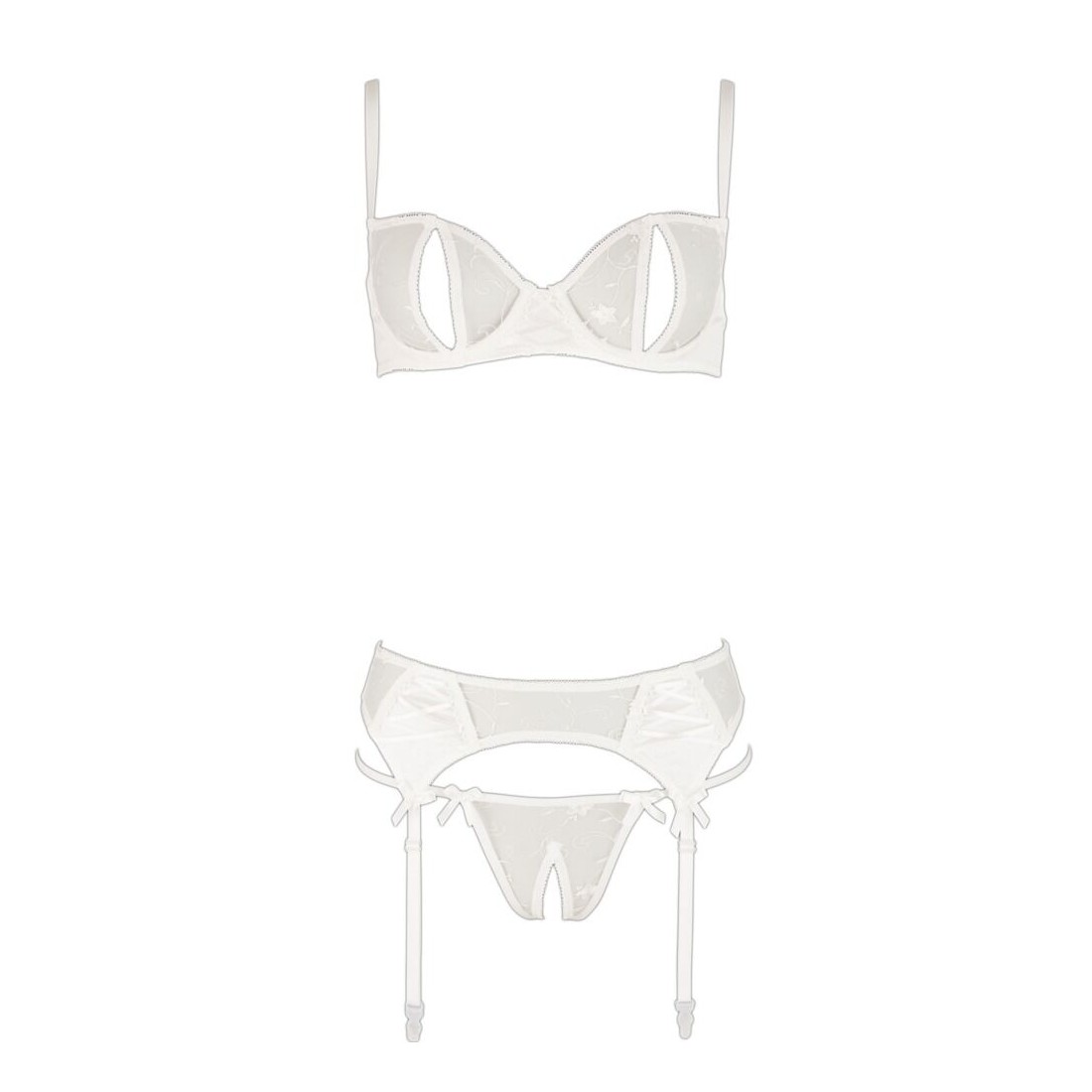 Set delicato fatto di maglia fine ricamata in combinazione con raso elastico e piccole allacciature decorative. Reggiseno con ferretto con coppe a spacco e spalline regolabili. Reggicalze con bretelle regolabili, chiusura a gancio sul retro. Perizoma abbinato con cavallo aperto.