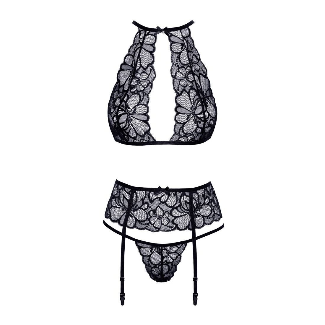 Morbido reggiseno, reggicalze e perizoma di Kissable completamente realizzato in pregiato pizzo floreale. Morbido ed elastico su tutto il perimetro per il massimo comfort. Reggiseno elegante con chiusura a gancetto sul collo e sulla schiena. Cintura per bretelle con chiusura a gancio sul retro, le bretelle sono regolabili per adattarsi. Il piccolo perizoma seduce con le sue due strette fasce elastiche che si uniscono all'inguine.