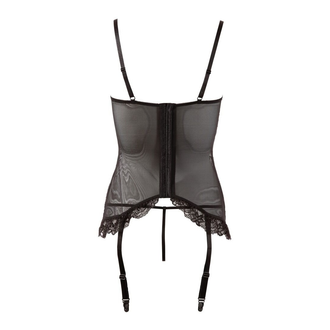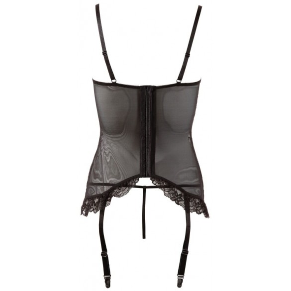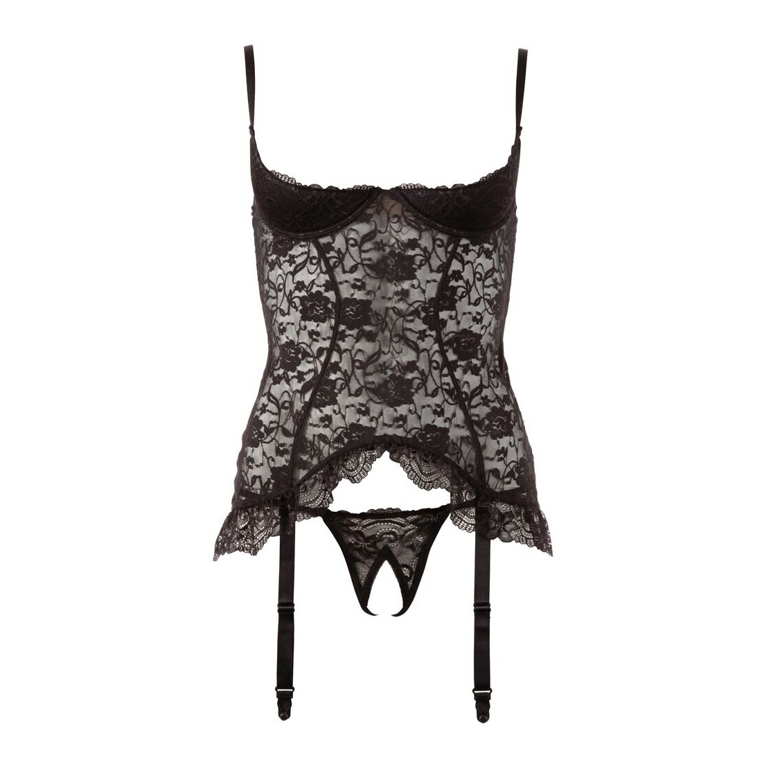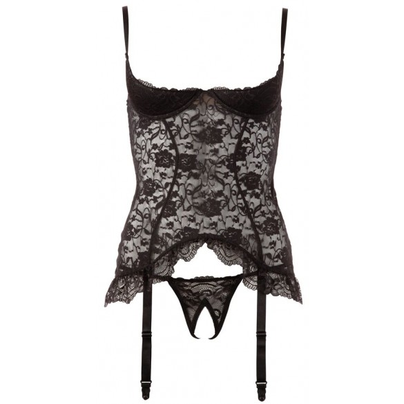 Chemise con reggicalze in pizzo, leggermente foderata e con coppe aperte. Chiusura a gancio sul retro. Le 4 bretelle sono regolabili e rimovibili. Con decorazione a volant sull'orlo. Include perizoma abbinato con cavallo totalmente aperto.