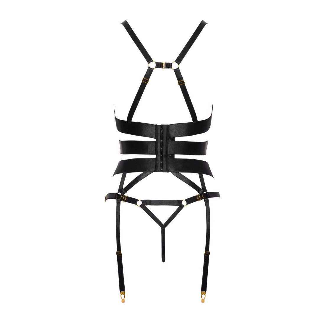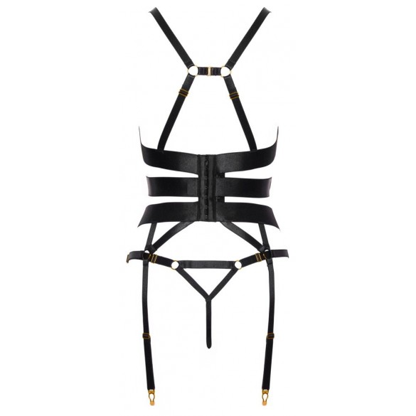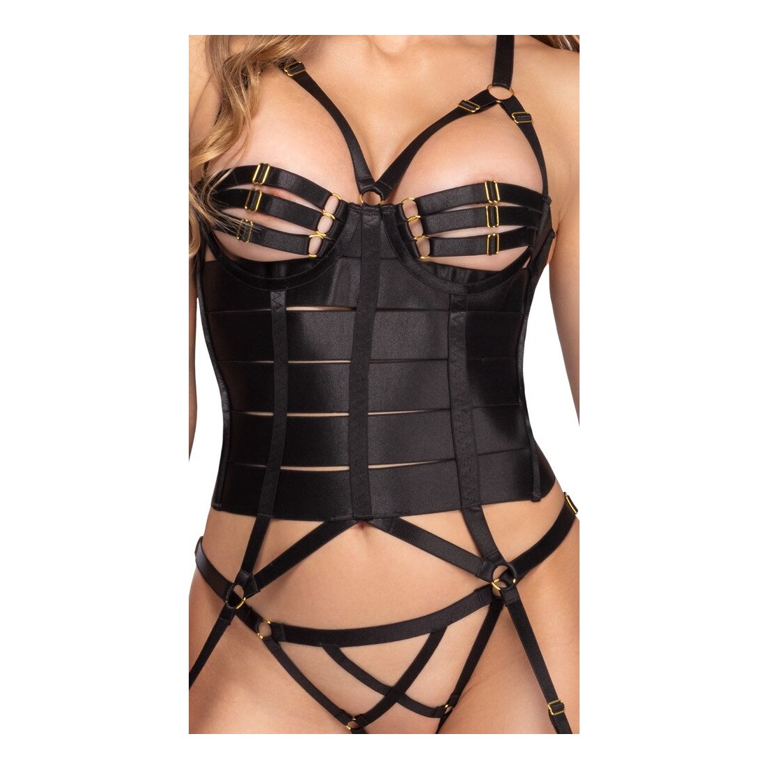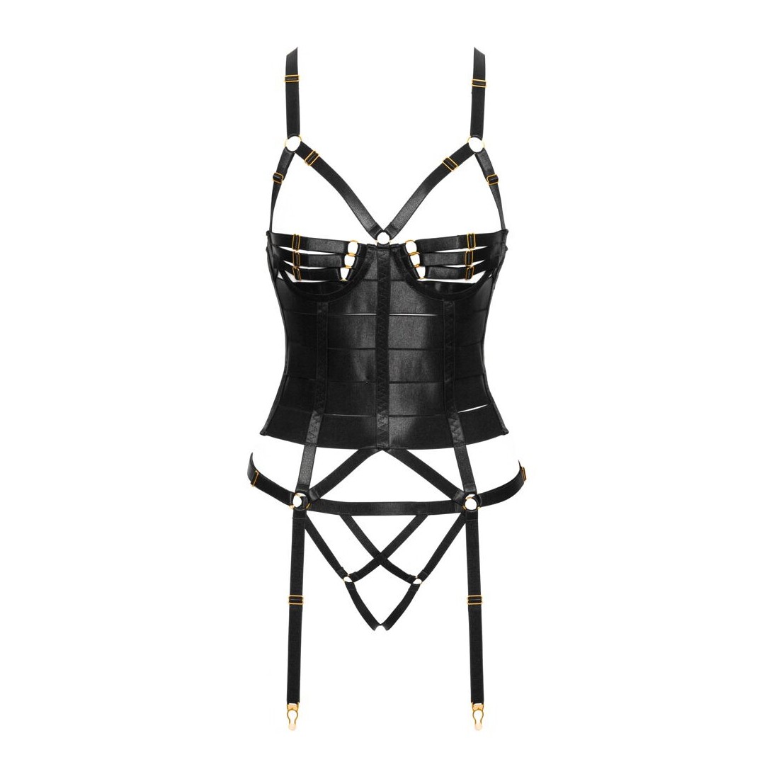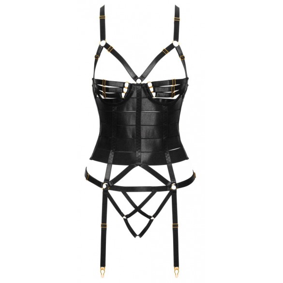 Corsetto reggicalze nero e perizoma inguinale di Cottelli LINGERIE. Design elegante e dettagliato con bande elastiche e spalline elastiche in un sofisticato look satinato con accessori color oro. Morbido ed elastico su tutto il corpo per il massimo comfort. Corsetto con stecche integrate e chiusura a gancio regolabile sul retro. Le spalline sono collegate sul retro con un gancio, le numerose coppe e le bretelle sono regolabili per una vestibilità assolutamente perfetta. Il perizoma con spalline è (non solo) eccitantemente aperto all'inguine.