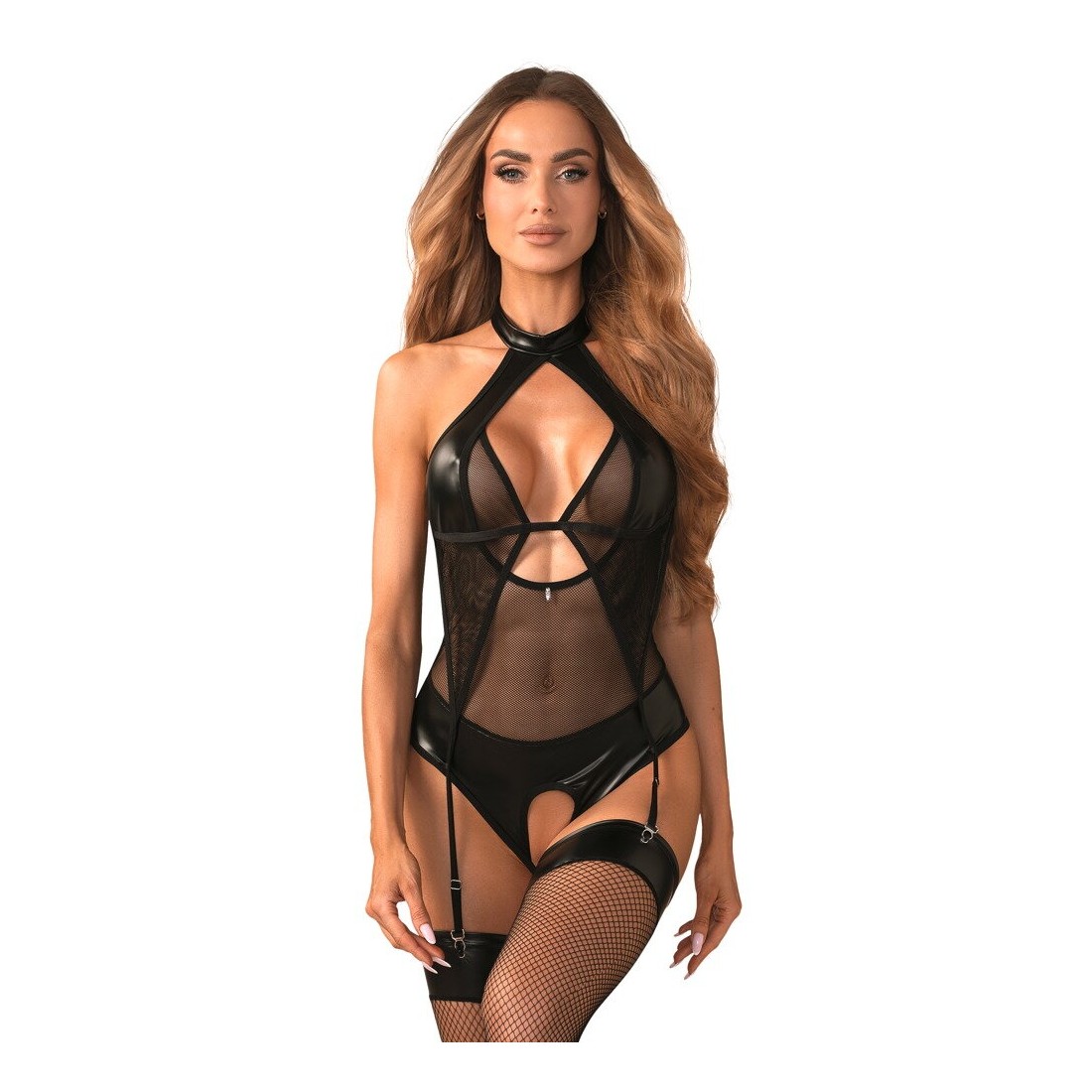 Body reggicalze nero Dominna crotchless di Obsessive in un elegante mix di rete morbida e sottile e un elegante wet look. Stravagante taglio sul davanti con piccolo dettaglio gioiello. Eccitante senza spalline e senza schienale, collo alto alla moda con elegante chiusura. Le due bretelle sul davanti possono essere regolate per adattarsi, così come le cinghie elastiche sul cavallo aperto e sui glutei esposti.