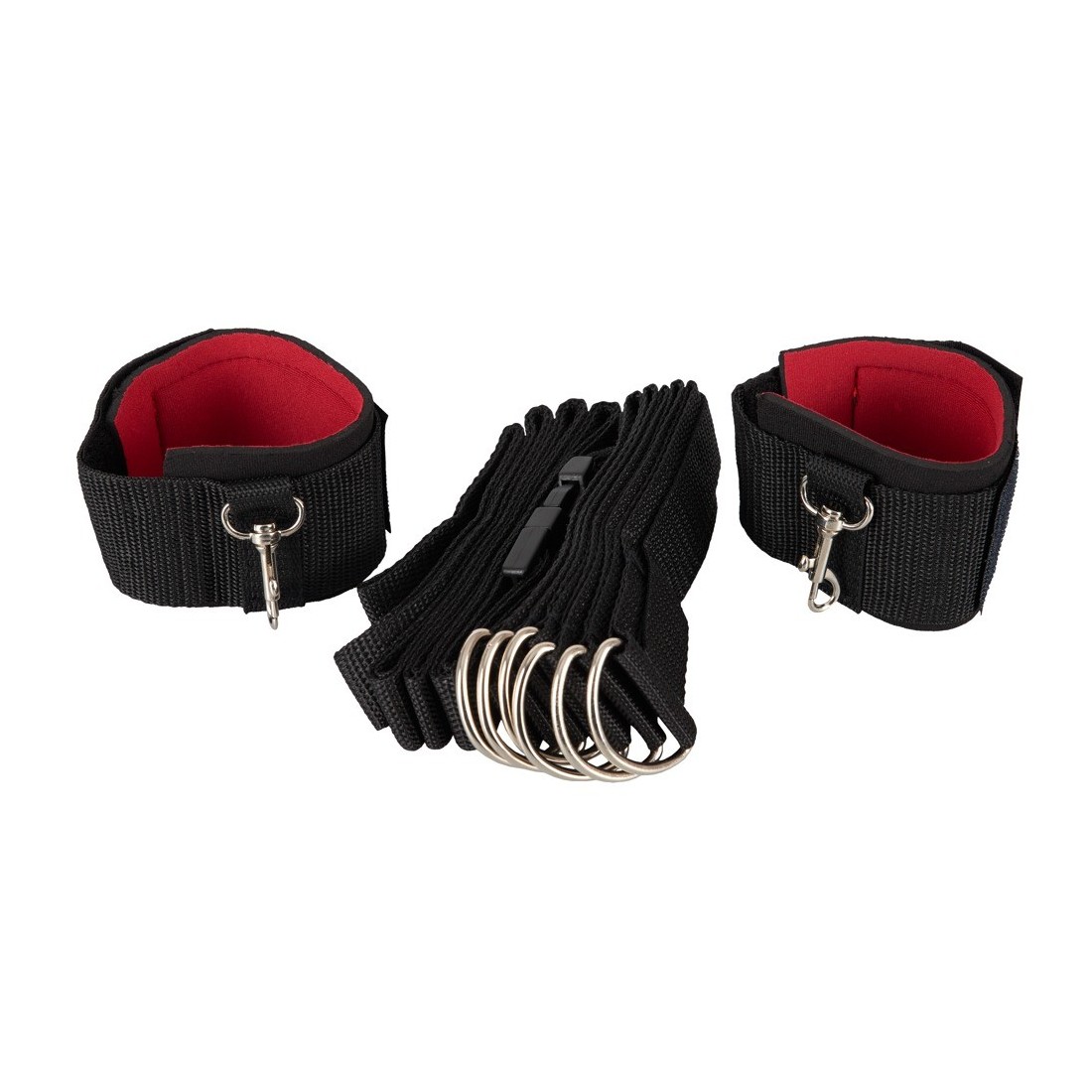 La fascia da letto regolabile in lunghezza (5 m di lunghezza) pu essere fissata attorno ad ogni telaio del letto. I polsini imbottiti per il polso possono essere ora agganciati con 6 occhielli in metallo con ganci a moschettone. Tu decidi la tua distanza e posizione polsini con velcro regolabili.
