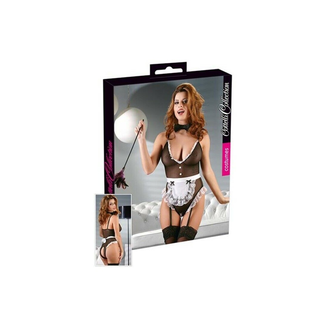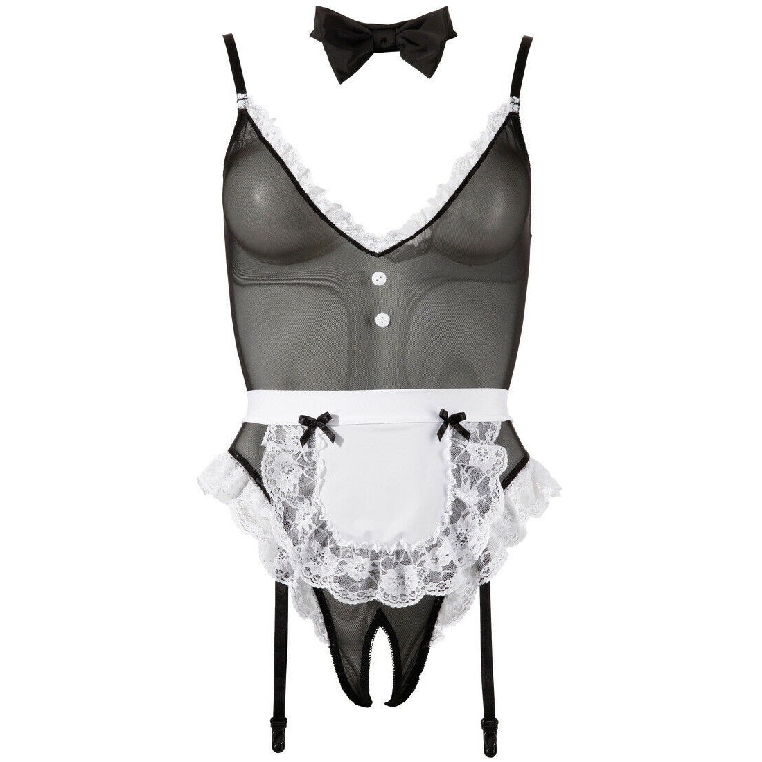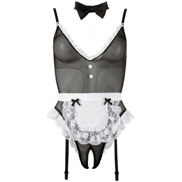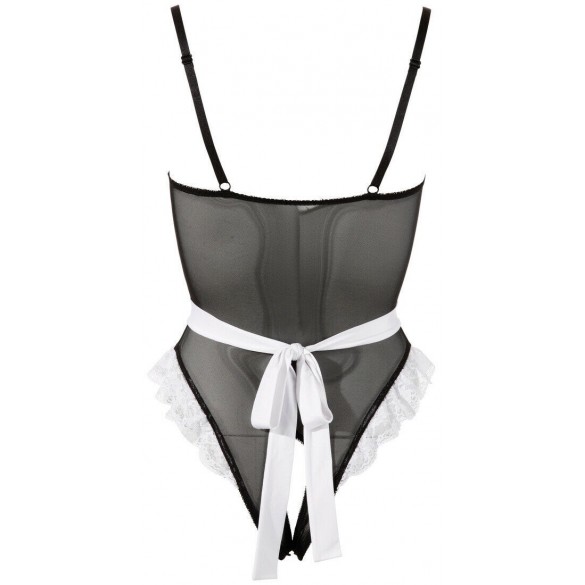 Body da sexy cameriera con ampia scolltura tonda apertura anteriore e posteriore dotato anche di guepiere. Cravattino e grembiule incluso TAGLIA M.
