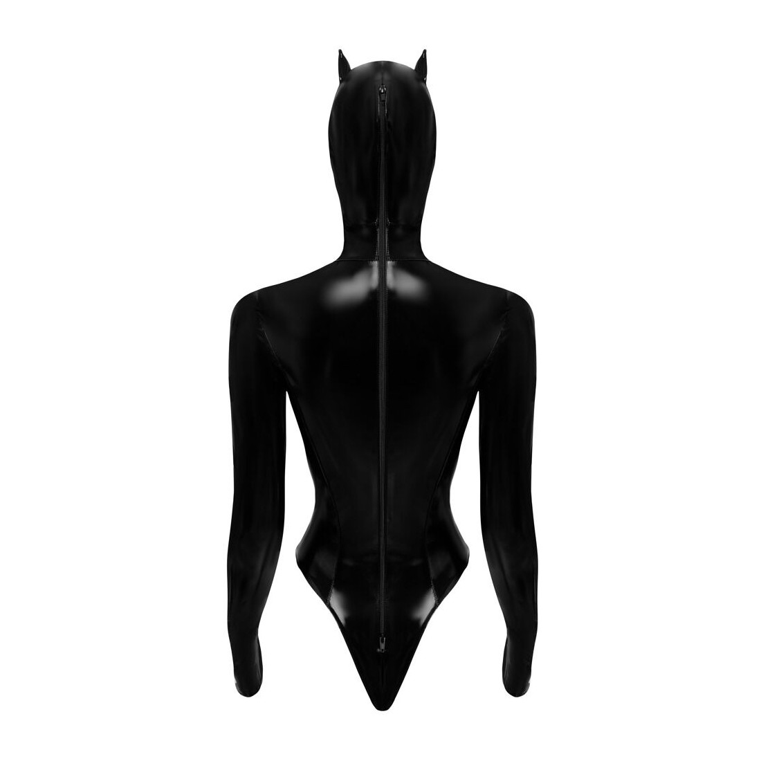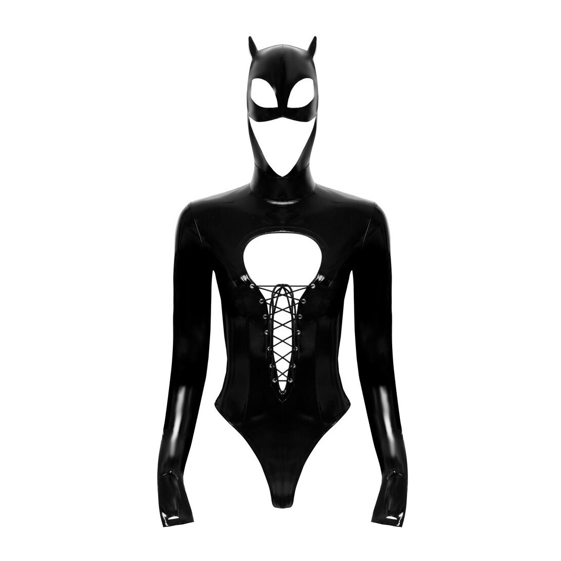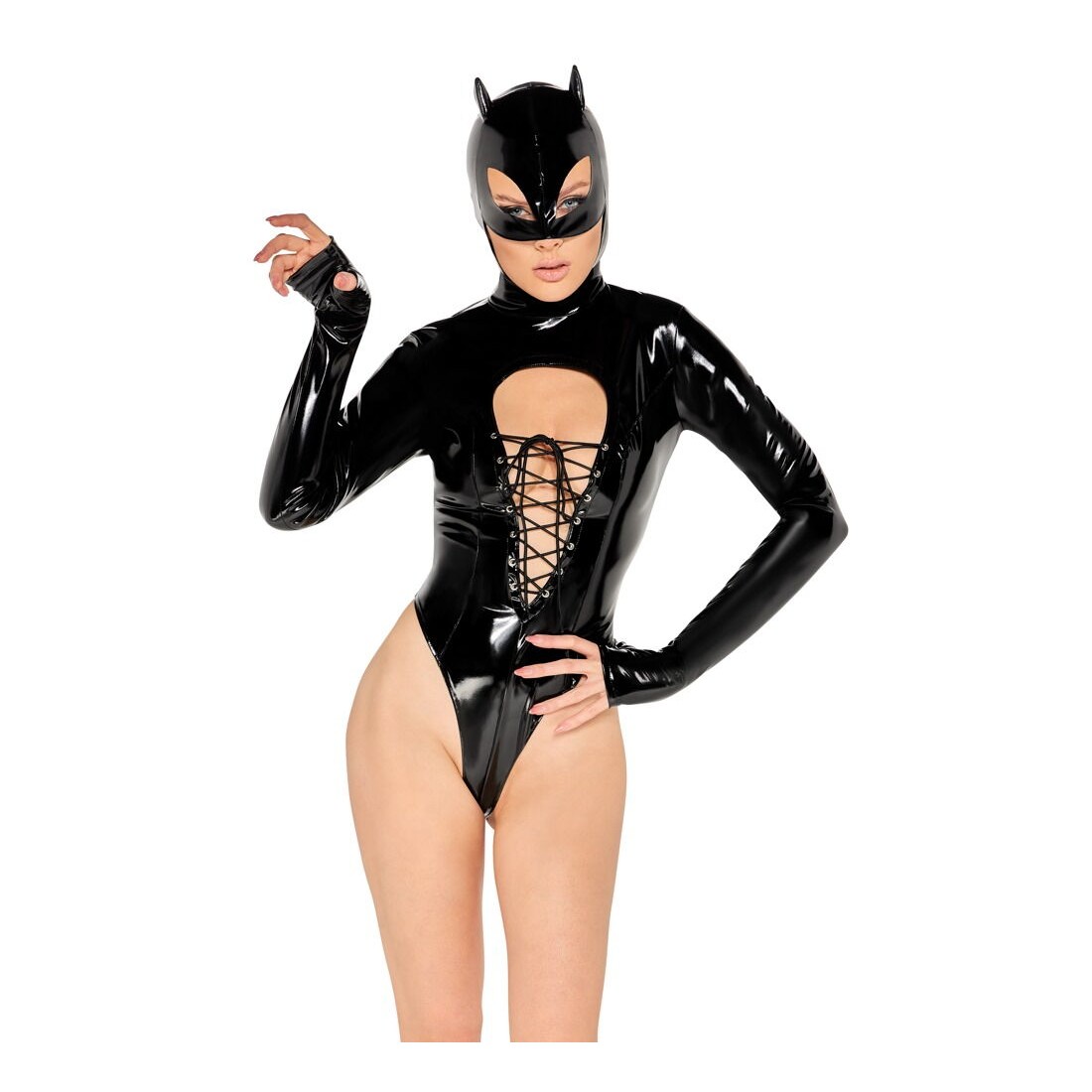 Stravagante body di Black Level con maschera per la testa cucita, tutto in vernice nera. Taglio aderente con spacchi extra alti sulle gambe. Taglio generoso sul davanti con occhielli argentati per un'allacciatura variabile fino all'ombelico. Maniche extra lunghe con pollice. Maschera per la testa in stile gatto/Batwoman con piccole orecchie e aperture per gli occhi, la parte inferiore del viso rimane libera. Zip lunga a 2 vie nella parte posteriore, dalla testa alla culatta. Chiusura al cavallo con bottoni a pressione.