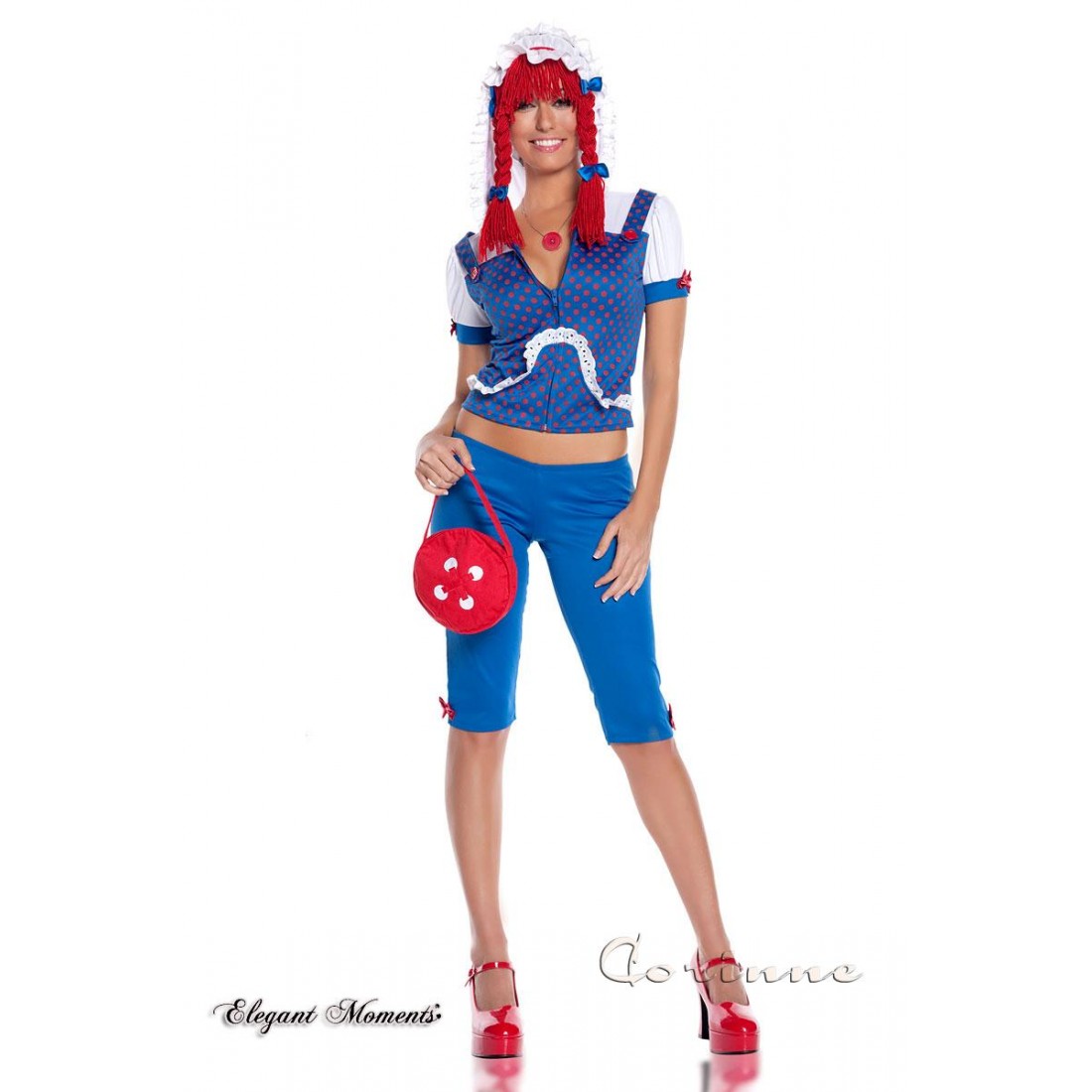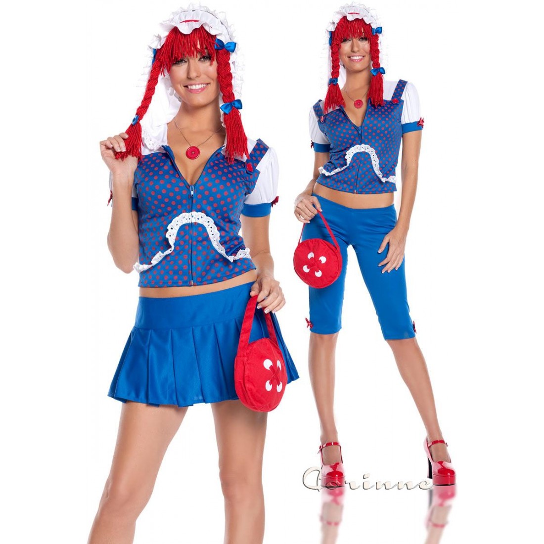 Grazioso travestimento da bambola di pezza 5 pezzi. Comprende maglia a mezze maniche bianca e blu con pois rossi, munita di cerniera anteriore e cappuccio con bordi ricamati, borsa tonda in tessuto e collanina con ciondolo bottone. Contiene sia una gonna plissettata con fiocco, sia un pinocchietto con fiocchetti alle estremità. Parrucca non inclusa.