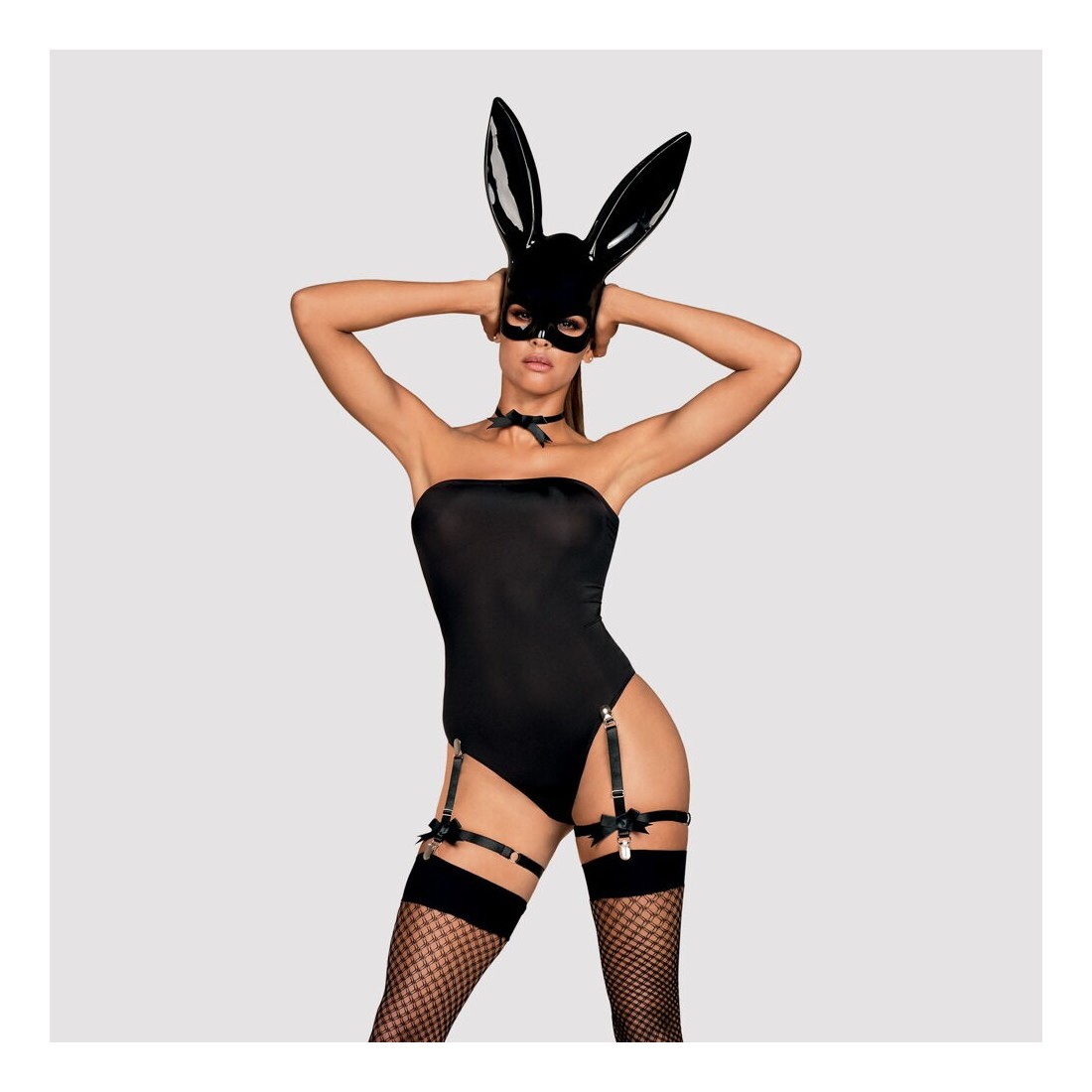 Set di costumi da coniglietta di Obsessive in nero. Composto da un corpo, una maschera per la testa in vinile con orecchie, un colletto e un paio di bretelle a clip e calze a rete. Corpo morbido elasticizzato in stile tubo senza spalline. Maschera a mezza testa con aperture per gli occhi, lacci sul retro. Colletto in raso da annodare. Le bretelle a clip staccabili sono rifinite con bande e fiocchi sulle cosce.