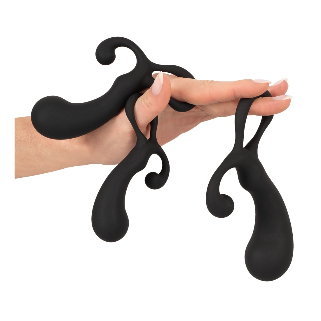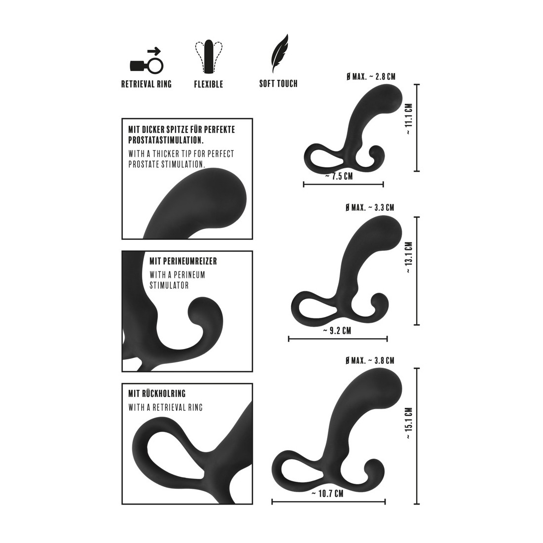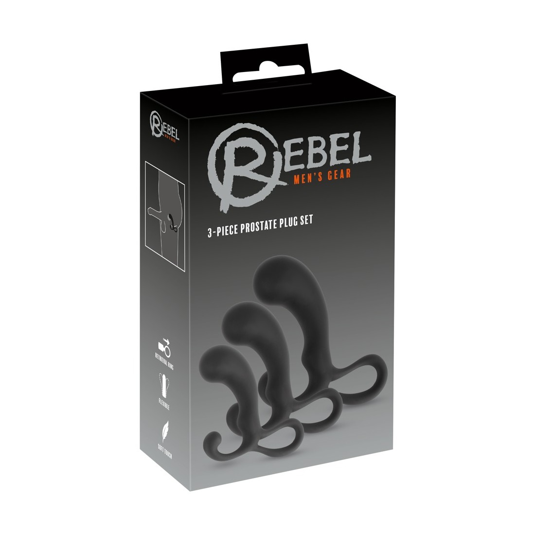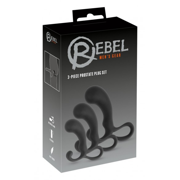 3-Piece Prostate Plug Set di Rebel con 3 plug anali di diverse dimensioni e pesi per una stimolazione mirata della prostata e un perfetto allenamento di stretching. Ogni plug dalla forma ergonomica e ottimale con la punta del punto P, lo stimolatore del perineo curvo e il pratico anello per le dita che funge anche da tappo. Dimensioni: