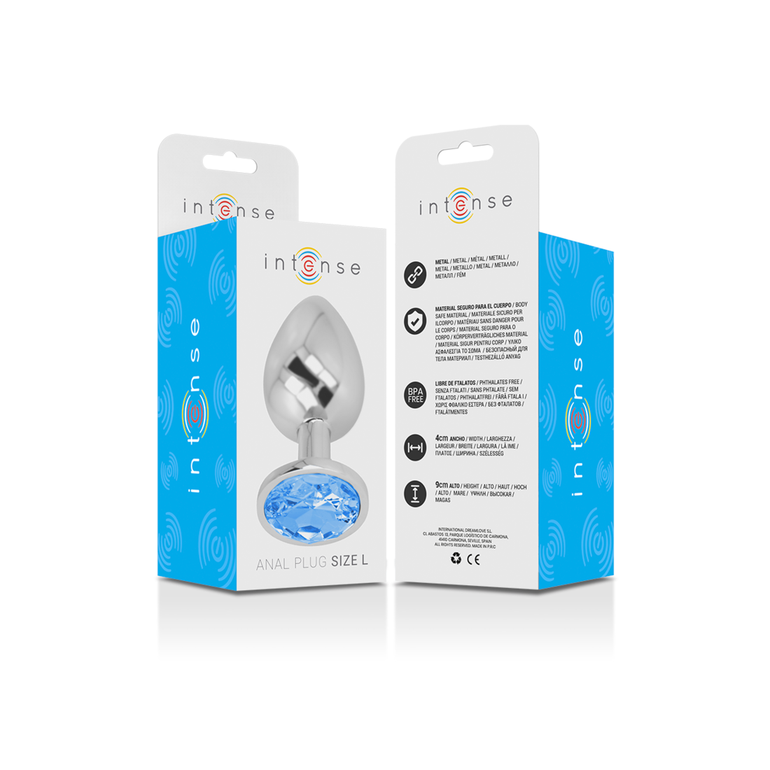 Fai risplendere i tuoi glutei con il plug anale Intense™, decorato con un gioiello di diamanti. Questo plug di alta qualità in metallo con dettagli blu lucidi aggiunge glamour alle tue avventure anali.