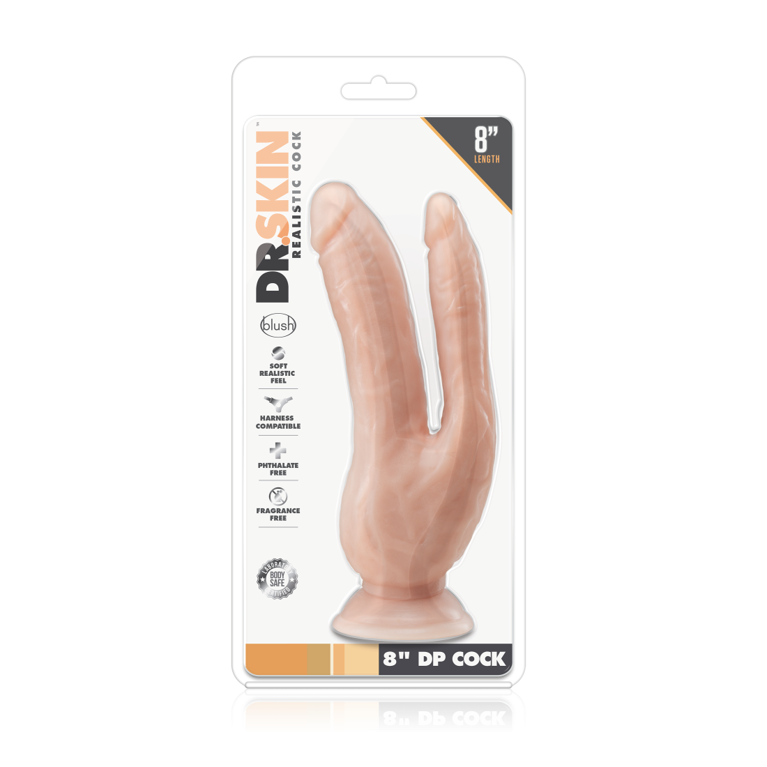 Il dottore è qui! Il Dr. Skin 8 Inch DP Cock ti dà la libertà di esplorare le tue fantasie di doppia penetrazione! Con una forte base a ventosa, Dr. Skin si attaccherà a qualsiasi superficie liscia e piana per un divertimento a mani libere. Con due diverse circonferenze di dildo, Dr. Skin 8 Inch DP Cock ha le dimensioni per riempirti comodamente. Entrambi i dildo sono realizzati per sembrare e sentirsi reali. Inoltre si flettono perfettamente con il tuo corpo! Realizzato in PVC non poroso, questo giocattolo è privo di ftalati e facile da pulire.