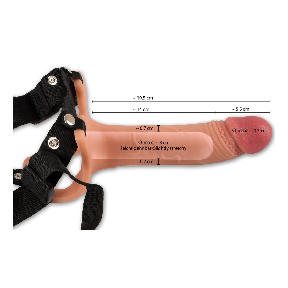 Lunghezza totale 19,5 cm, profondità di inserimento 14 cm, Ø interno 3,2 cm, Ø esterno 4,3 cm, circonferenza vita max. 144 cm. Silicone (silicone liquido); cintura in vita: polipropilene, poliestere, spandex, metallo.